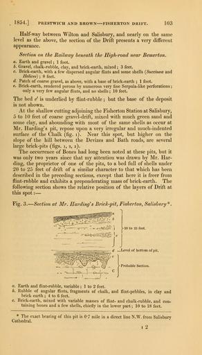 | Keywords: The Quarterly journal of the Geological Society of London (12711385265).jpg 1854 <br> PRESTWICH AND BROWN FISHERTON DRIFT <br> 103 <br> Half-way between Wilton and Salisbury and nearly on the same <br> level as the above the section of the Drift presents a very different <br> appearance <br> Section on the Railway beneath the High-road near Bemerton <br> a Earth and gravel ; 1 foot <br> b Gravel chalk-rubble clay and brick-earth mixed ; 3 feet <br> c Brick-earth with a few dispersed angular flints and some shells Succinece and <br> Helices ; 8 feet <br> d Patch of coarse gravel as above with a base of brick-earth ; 1 foot <br> e Brick-earth rendered porous by numerous very fine Serpula-like perforations ; <br> only a very few angular flints and no shells ; 10 feet <br> The bed e' is underlied by flint-rubble ; but the base of the deposit <br> is not shown <br> At the shallow cutting adjoining the Fishertou Station at Salisbury <br> 5 to 10 feet of coarse gravel-drift mixed with much green sand and <br> some clay and abounding with most of the same shells as occur at <br> Mr Harding's pit repose upon a very irregular and much-indented <br> surface of the Chalk fig i Near this spot but higher on the <br> slope of the hill between the Devizes and Bath roads are several <br> large brick-pits figs i 2 3 <br> The occurrence of Bones had long been noted at these pits but it <br> was only two years since that my attention was drawn by Mr Har- <br> ding the proprietor of one of the pits to a bed full of shells under <br> 20 to 25 feet of drift of a similar character to that which has been <br> described in the preceding sections except that here it is freer from <br> flint-rnbble and exhibits a preponderating mass of brick-earth The <br> following section shows the relative position of the layers of Drift at <br> this spot ” <br> Fig 3 ” Section at Mr Harding s Brick-pit Fisherton Salisbury <br> 20 to 25 feet <br> – Sr« ai -c- p - ;e <br> J <br> --- ;- ; d Level of bottom of pit <br> Probable Section <br> Earth and flint-rubble variable ; 1 to 2 feet <br> Rubble of angular flints fragments of chalk and flint-pebbles in clay and <br> brick earth ; 4 to 6 feet <br> Brick-earth mixed with variable masses of flint- and chalk-rubble and con- <br> taining bones and a few shells chiefly in the lower part ; 10 to 18 feet <br> The exact bearing of this pit is 0 7 mile in a direct line N W from Salisbury <br> Cathedral <br> I 2 35614673 110213 51125 Page 103 Text v 11 http //www biodiversitylibrary org/page/35614673 1855 Geological Society of London Biodiversity Heritage Library The Quarterly journal of the Geological Society of London v 11 1855 Geology Periodicals Smithsonian Libraries bhl page 35614673 dc identifier http //biodiversitylibrary org/page/35614673 smithsonian libraries Information field Flickr posted date ISOdate 2014-02-23 Check categories 2015 August 26 CC-BY-2 0 BioDivLibrary https //flickr com/photos/61021753 N02/12711385265 2015-08-26 20 59 13 cc-by-2 0 PD-old-70-1923 The Quarterly journal of the Geological Society of London 1855 Photos uploaded from Flickr by Fæ using a script |