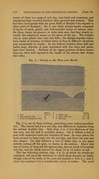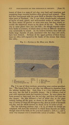 | Keywords: The Quarterly journal of the Geological Society of London (12684585315).jpg 418 PROCEEDINGS OF THE GEOLOGICAL SOCIETY June 16 <br> lowest of these is a mass of red clay very hard and tenacious and <br> containing large rounded boulders often grooved and striated This <br> bed thus corresponds with the great Drift or Boulder Clay deposit in <br> other parts of Scotland On it rest thick shingle-banks composed <br> of layers of sand gravel and well-rounded stones of various sizes <br> On these stones no grooves or striae were seen but they closely re- <br> semble the waterworn stones on the shore of the sea The boulder <br> clay in some places rises into low hills ; the shingle-deposits rather <br> form banks or terraces of which three or four at different elevations <br> may occasionally be traced In the hollows between these hills and <br> banks large deposits of peat associated with fine clays and sands <br> have been formed Sections of the upper portions of these forma- <br> tions are often well exposed in the banks of the stream that drains <br> this valley <br> Fig 3 ” Section in the Moss neai' Backs <br> inches <br> « Soil 12 to 14 <br> 6 Brownish-red clay 12 <br> c Deep red ferruginous clay 12 <br> inches <br> d White clay 8 to 10 <br> e Peat with trees 10 ” 20 <br> / Red clay 24 ” 36 <br> Fig 3 is one of these sections presenting some curious peculiari- <br> ties The lowest bed /is a red clay but different in character from <br> the inferior boulder clay Only from 2 to 3 feet thickness of this <br> was seen but the bed is probably deeper On it follows a bed of <br> peat with numerous roots and branches of trees In some places the <br> roots seemed to have sunk into the red clay and there the peat was <br> also deeper On this followed a bed of white clay in one place <br> entirely cutting off the peat as shown in the section Above this <br> was 1 2 inches of deep red ferruginous clay then as much of brownish <br> red clay and the whole covered by about 12 or 14 inches of soil <br> The two following sections figs 4 5 of which the details are <br> subjoined will show the variations to which these deposits are liable <br> though some of the beds as the peat-bed marked e with d c and b <br> seem very constant over a considerable extent of surface The wood 35461494 109911 51125 Page 418 Text v 8 http //www biodiversitylibrary org/page/35461494 1852 Geological Society of London Biodiversity Heritage Library The Quarterly journal of the Geological Society of London v 8 1852 Geology Periodicals Smithsonian Libraries bhl page 35461494 dc identifier http //biodiversitylibrary org/page/35461494 smithsonian libraries Information field Flickr posted date ISOdate 2014-02-21 Check categories 2015 August 26 CC-BY-2 0 BioDivLibrary https //flickr com/photos/61021753 N02/12684585315 2015-08-26 20 59 36 cc-by-2 0 PD-old-70-1923 The Quarterly journal of the Geological Society of London 1852 Photos uploaded from Flickr by Fæ using a script |