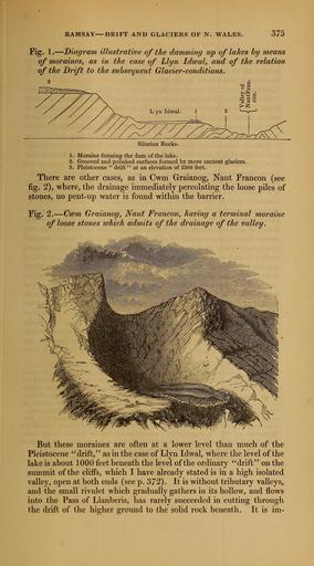 | Keywords: The Quarterly journal of the Geological Society of London (12684806254).jpg RAMSAY DRIFT AND GLACIERS OF N WALES <br> 375 <br> Fig 1 Diagram illustrative of the damming up of lakes by means <br> of moraines as in the case of Llyn Idwal and of the relation <br> of the Drift to the subsequent Glacier-conditions <br> ˘ S <br> Silurian Rocks <br> 1 Moraine forming the dam of the lake <br> 2 Grooved and polished surfaces formed by more ancient glaciers <br> 3 Pleistocene drift at an elevation of 2300 feet <br> There are other cases as in Cwm Graianog Nant Francon see <br> fig 2 where the drainage immediately percolating the loose piles of <br> stones no pent-up water is found within the barrier <br> Fig 2 Cwm Graianog Nant Francon having a terminal moraine <br> of loose stones which admits of the drainage of the valley <br> But these moraines are often at a lower level than much of the <br> Pleistocene drift as in the case of Llyn Idwal where the level of the <br> lake is about 1000 feet beneath the level of the ordinary drift on the <br> summit of the cliffs which I have already stated is in a high isolated <br> valley open at both ends see p 372 It is without tributary valleys <br> and the small rivulet which gradually gathers in its hollow and flows <br> into the Pass of Llanberis has rarely succeeded in cutting through <br> the drift of the higher ground to the solid rock beneath It is im- 35461443 109911 51125 Page 375 Text v 8 http //www biodiversitylibrary org/page/35461443 1852 Geological Society of London Biodiversity Heritage Library The Quarterly journal of the Geological Society of London v 8 1852 Geology Periodicals Smithsonian Libraries bhl page 35461443 dc identifier http //biodiversitylibrary org/page/35461443 smithsonian libraries Information field Flickr posted date ISOdate 2014-02-21 Check categories 2015 August 26 CC-BY-2 0 BioDivLibrary https //flickr com/photos/61021753 N02/12684806254 2015-08-27 12 53 53 cc-by-2 0 PD-old-70-1923 The Quarterly journal of the Geological Society of London 1852 Photos uploaded from Flickr by FĂŚ using a script |