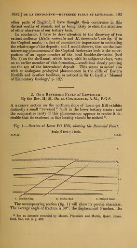 | Keywords: The Quarterly journal of the Geological Society of London (12684314643).jpg 1852 DE LA CONDAMINE REVERSED FAULT AT LEWISHAM 193 <br> other parts of England I have thought their occurrence in this <br> district worthy of remark and as heing likely to elicit the attention <br> of other observers of our tertiary beds <br> In conclusion I have to draw attention to the discovery of two <br> extinct molluscs Helix ruderata and H incarnata see fig 4 in <br> the Copford marls ” a fact of considerable importance in estimating <br> the relative age of this deposit ; and I would observe that not the least <br> interesting phsenomenon of the Copford freshwater beds is the super- <br> position of an upper member of the local boulder-formation bed <br> No 1 on the shell-marl which latter with its subjacent clays rests <br> on an earlier member of this formation ” conditions clearly pointing <br> out the age of the intercalated deposit This seems to accord also <br> with an analogous geological phsenomenon in the cliffs of Eastern <br> Norfolk and in other localities as noticed in Sir C Lyell's Manual <br> of Elementary Geology ' p 127 <br> 2 On a Reversed Fault at Lewisham <br> By the Rev H M De la Condamine A M F G S <br> A RECENT section on the northern slope of Loam-pit Hill exhibits <br> distinctly a small reversed fault in the lower tertiary strata; and <br> the comparative rarity of this phsenomenon appears to render it de- <br> sirable that its existence in this locality should be noticed <br> Fig 1 ” Section at Loam Pit Hill showing the Reversed Fault <br> Scale 6 feet l inch <br> N N w <br> S S E <br> 1 London Clay 2 Pebble Bed 3 Striped Sand <br> The accompanying section fig 1 will show its precise character <br> The average angle of fracture is 30° the displacement 6 inches Its <br> See an instance recorded by Messrs Prestwich and Morris Quart Journ <br> Geol Soc vol ii p 402 35461199 109911 51125 Page 193 Text v 8 http //www biodiversitylibrary org/page/35461199 1852 Geological Society of London NameFound H incarnata Biodiversity Heritage Library The Quarterly journal of the Geological Society of London v 8 1852 Geology Periodicals Smithsonian Libraries bhl page 35461199 dc identifier http //biodiversitylibrary org/page/35461199 smithsonian libraries Information field Flickr posted date ISOdate 2014-02-21 Check categories 2015 August 26 CC-BY-2 0 BioDivLibrary https //flickr com/photos/61021753 N02/12684314643 2015-08-27 12 55 47 cc-by-2 0 PD-old-70-1923 The Quarterly journal of the Geological Society of London 1852 Photos uploaded from Flickr by Fæ using a script |