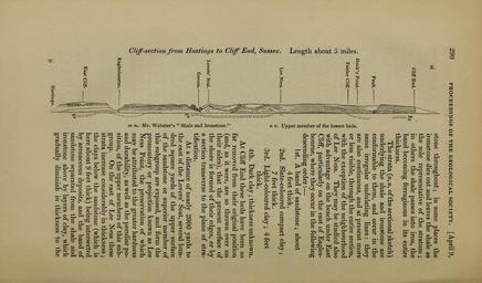 | Keywords: The Quarterly journal of the Geological Society of London (12683689854).jpg 290 <br> PROCEEDINGS OF THE GEOLOGICAL SOCIETY April 9 <br> 5« <br> 22 <br> 5 <br> o <br> «0 <br> H <br> Cliff End <br> o <br> OS <br> Fault <br> Hook's Point ' <br> Fairlee Cliff - <br> 60 <br> Lee Ness <br> Lovers' Seat <br> Covers <br> Eaglesboume ¢ <br> East Cliff <br> gs <br> Hastings <br> stone throughout; in some places the <br> ironstone dies out and leaves the shale as <br> the sole representative of the stratum ; <br> in others the shale passes into iron the <br> band becoming ferruginous in its entire <br> thickness <br> The strata n of the sectional sketch <br> underlying the shale and ironstone are <br> conformable to them and occur in the <br> same irregular undulating lines they <br> are also continuous and at present more <br> or less visible through the entire section <br> with the exception of the neighbourhood <br> of Lee Ness They may be studied also <br> with advantage on the beach under East <br> Cliff particularly on the east of Eagles- <br> bourne where they occur in the following <br> descending order ” <br> 1st A band of sandstone ; about <br> 4 feet thick <br> 2nd Slate-coloured compact clay ; <br> 7 feet thick <br> 3rd Light-coloured clay ; 4 feet <br> thick <br> 4th Dark clay ; thickness unknown <br> At Cliff End these beds have been so <br> far removed from their original position <br> and as it were are so thrown over on <br> their sides that the present surface of <br> the shore is formed of their edges or by <br> a section transverse to the plane of stra- <br> tification <br> At a distance of nearly 2000 yards to <br> the east of the Lovers' Seat several hun- <br> dred square yards of the upper surface <br> of the sandstone or superior member of <br> this subgroup are exposed and form the <br> promontory or projection known as Lee <br> Ness Point the preservation of which <br> may be attributed to the greater hardness <br> and durability as well as the peculiar po- <br> sition of the upper members of this sub- <br> group On the east of Lee Ness these <br> strata increase considerably in thickness ; <br> the clays below the sandstone which is <br> here about 9 feet thick being intersected <br> by arenaceous deposits and the band of <br> sandstone separated from the shale and <br> ironstone above by layers of clay which <br> gradually diminish in thickness to the 35338743 109655 51125 Page 290 Text v 12 http //www biodiversitylibrary org/page/35338743 1856 Geological Society of London Biodiversity Heritage Library The Quarterly journal of the Geological Society of London v 12 1856 Geology Periodicals Smithsonian Libraries bhl page 35338743 dc identifier http //biodiversitylibrary org/page/35338743 smithsonian libraries Information field Flickr posted date ISOdate 2014-02-21 Check categories 2015 August 26 CC-BY-2 0 BioDivLibrary https //flickr com/photos/61021753 N02/12683689854 2015-08-27 11 55 36 cc-by-2 0 PD-old-70-1923 The Quarterly journal of the Geological Society of London 1856 Photos uploaded from Flickr by Fæ using a script |