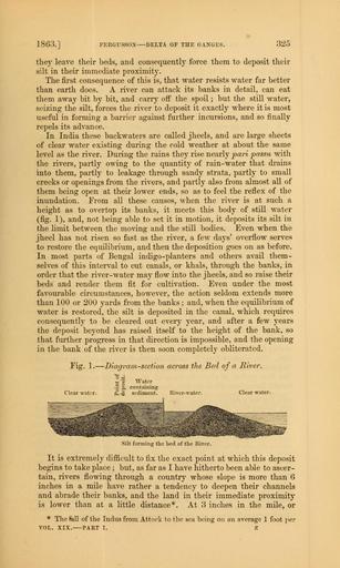 | Keywords: The Quarterly journal of the Geological Society of London (12645922603).jpg 1863 <br> FERGUSSOX DELTA OP THE GAXGF S <br> 32 <br> they leave their beds and consequently force them to deposit their <br> silt in their immediate proximity <br> The first consequence of this is that water resists water far better <br> than earth does A river can attack its banks in detail can eat <br> them away bit by bit and carry off the spoil ; but the still water <br> seizing the silt forces the river to deposit it exactly where it is most <br> useful in forming a barrier against further incursions and so finally <br> repels its advance <br> In India these backwaters are called j heels and are large sheets <br> of clear water existing during the cold weather at about the same <br> level as the river During the rains they rise nearly pari passu with <br> the rivers partly owing to the quantity of rain-water that drains <br> into them partly to leakage through sandy strata partly to small <br> creeks or openings from the rivers and partly also from almost all of <br> them being open at their lower ends so as to feel the reflex of the <br> inundation From all these causes when the river is at such a <br> height as to overtop its banks it meets this body of still water <br> fig 1 and not being able to set it in motion it deposits its silt in <br> the limit between the moving and the still bodies Even when the <br> jheel has not risen so fast as the river a few days' overflow serves <br> to restore the equilibrium and then the deposition goes on as before <br> In most parts of Bengal indigo -planters and others avail them- <br> selves of this interval to cut canals or khals through the banks in <br> order that the river-water may flow into the jheels and so raise their <br> beds and render them fit for cultivation Even under the most <br> favourable circumstances however the action seldom extends more <br> than 100 or 200 yards from the banks ; and when the equilibrium of <br> water is restored the silt is deposited in the canal which requires <br> consequently to be cleared out every year and after a few years <br> the deposit beyond has raised itself to the height of the bank so <br> that further progress in that direction is impossible and the opening <br> in the bank of the river is then soon completely obliterated <br> Fig 1 ” Diagram-section across the Bed of a River <br> Clear water <br> – w '35 Water <br> 5 a containing <br> p sediment River-Water <br> Clear water <br> Silt forming the bed of the River <br> It is extremely difficult to fix the exact point at which this deposit <br> begins to take place ; but as far as I have hitherto been able to ascer- <br> tain rivers flowing through a country whose slope is more than 6 <br> inches in a mile have rather a tendency to deepen their channels <br> and abrade their banks and the land in their immediate proximity <br> is lower than at a little distance At 3 inches in the mile or <br> The fell of the Indus from Attoek to the sea being on an average 1 foot per <br> VOL XIX PART I Z 35328296 109632 51125 Page 325 Text v 19 http //www biodiversitylibrary org/page/35328296 1863 Geological Society of London Biodiversity Heritage Library The Quarterly journal of the Geological Society of London v 19 1863 Geology Periodicals Smithsonian Libraries bhl page 35328296 dc identifier http //biodiversitylibrary org/page/35328296 smithsonian libraries Information field Flickr posted date ISOdate 2014-02-20 Check categories 2015 August 26 CC-BY-2 0 BioDivLibrary https //flickr com/photos/61021753 N02/12645922603 2015-08-27 11 52 41 cc-by-2 0 PD-old-70-1923 The Quarterly journal of the Geological Society of London 1863 Photos uploaded from Flickr by Fæ using a script |