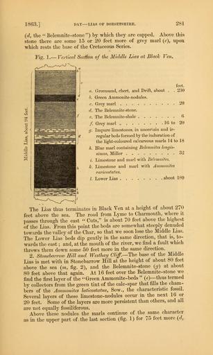 | Keywords: The Quarterly journal of the Geological Society of London (12645897753).jpg 1863 <br> DAY LIAS OF DORSETSHIRE <br> 281 <br> d the Belemnite-stone by which they are capped Above this <br> stone there are some 15 or 20 feet more of grey marl c upon <br> which rests the base of the Cretaceons Series <br> Fig 1 ” Vertical Section of the Middle Lias at Black Ven <br> feet <br> a Greensand chert and Drift about 230 <br> b Green Ammonite-nodules <br> c Grey marl 20 <br> d The Belemnite -stone <br> e The Belemnite-shale <br> / Grey marl 1G to 20 <br> g Impure limestones in uncertain and ir- <br> regular beds formed by the induration of <br> the light-coloured calcareous marls 14 to 18 <br> h Blue marl containing Belemnites longis- <br> simus Miller 32 <br> i Limestone and marl with Belemnifes <br> 1c Limestone and marl with Ammonites <br> raricostatus <br> I Lower Lias about 180 <br> The Lias thus terminates in Black Ven at a height of about 270 <br> feet above the sea The road from Lyme to Charmouth where it <br> passes through the east Cuts is about 70 feet above the highest <br> of the Lias Prom this point the beds are somewhat steeply denuded <br> towards the valley of the Char so that we soon lose the Middle Lias <br> The Lower Lias beds dip gently in the same direction that is to- <br> wards the east ; and at the mouth of the river we find a fault which <br> throws them down some 50 feet more in the same direction <br> 2 Stonebarrow Hill and Westhay Cliff ” The base of the Middle <br> Lias is met with in Stonebarrow Hill at the height of about 80 feet <br> above the sea m fig 2 and the Belemnite-stone g at about <br> 80 feet above that again At 16 feet over the Belemnite-stone we <br> find the first layer of the Green Ammonite-beds e ” thus termed <br> by collectors from the green tint of the calc-spar that fills the cham- <br> bers of the Ammonites laticostatus Sow the characteristic fossil <br> Several layers of these limestone-nodules occur in the next 16 or <br> 20 feet Some of the layers are more persistent than others and all <br> are not equally fossiliferous <br> Above these nodules the marls continue of the same character <br> as in the upper part of the last section fig 1 for 75 feet more d 35328246 109632 51125 Page 281 Text v 19 http //www biodiversitylibrary org/page/35328246 1863 Geological Society of London NameFound Ammonites laticostatus NameConfirmed Ammonites latisulcatus Quenstedt 1883 NameBankID 5470803 NameFound Ammonites raricostatus NameConfirmed Ammonites raricostatus Zieton 1831 NameFound Belemnites longis simus NameConfirmed Belemnites EOLID 4780330 NameBankID 4089090 Biodiversity Heritage Library The Quarterly journal of the Geological Society of London v 19 1863 Geology Periodicals Smithsonian Libraries bhl page 35328246 dc identifier http //biodiversitylibrary org/page/35328246 smithsonian libraries Information field Flickr posted date ISOdate 2014-02-20 Check categories 2015 August 26 CC-BY-2 0 BioDivLibrary https //flickr com/photos/61021753 N02/12645897753 2015-08-27 11 50 59 cc-by-2 0 PD-old-70-1923 The Quarterly journal of the Geological Society of London 1863 Photos uploaded from Flickr by Fæ using a script |