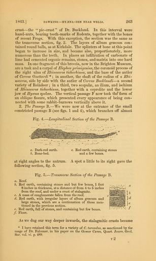 | Keywords: The Quarterly journal of the Geological Society of London (12645887573).jpg 1863 DAWKINS HY2ENA-DEN NEAR WELLS 263 <br> crust the pie-crust of Dr Buckland In this interval were <br> hazel-nuts bearing tooth-marks of Bodents together with the bones <br> of recent Frogs With this exception the section was the same as <br> the transverse section fig 2 The layers of album graecum con- <br> tained round balls as at Kirkdale The splinters ot bone at this point <br> began to increase in size and became also proportionately more <br> numerous than the teeth In places an infiltration of carbonate of <br> lime had cemented organic remains stones and matrix into one hard <br> mass In one fragment of this breccia now in the Brighton Museum <br> are a tusk and a carpal of Elephas primigenius the coronoid process of <br> the right ulna of Rhinoceros tichorliinus and the base of the antler <br> of Cervus Guettardi ; in another the shaft of the radius of a Rhi- <br> noceros side by side with the antler of Cervus Bucklandi a second <br> variety of Beindeer ; in a third two scapulae an ilium and ischium <br> of Rhinoceros tichorhinus together with a coprolite and the lower <br> jaw of Hycena spelcea The vertical passage F now took the form of <br> an oblique fissure which presented every appearance of being con- <br> nected with some rabbit-burrows vertically above it <br> 2 The Passage B We were now at the entrance of the small <br> constricted passage B see figs 1 and 4 which branches off almost <br> Fig 4 Longitudinal Section of the Passage B <br> ' ˘ L <br> a Dark-red earth e Red earth containing stones <br> b Bone-bed and a few bones <br> at right angles to the antrum A spot a little to its right gave the <br> following section fig 5 <br> Fig 5 Transverse Section of the Passage B <br> a Roof <br> b Red earth containing stones and but few bones 1 foot <br> 8 inches in thickness at a distance of from 4 to 5 inches <br> from the roof and under a crust of stalagmite <br> c A mass of conglomerate fallen from the roof <br> d Red earth with irregular layers of album grsecum and <br> large stones which are a continuation of those men- <br> tioned in the previous section <br> e Red earth full of stones and containing but few bones <br> / Floor <br> As we dug our way deeper inwards the stalagmitic crusts became <br> I have retained this term for a variety of C tarandus as sanctioned by the <br> usage of Dr Falconer in his paper on the Grower Caves Quart Journ GreoL <br> Soc vol vi p 489 <br> T2 35328228 109632 51125 Page 263 Text v 19 http //www biodiversitylibrary org/page/35328228 1863 Geological Society of London NameFound Cervus NameConfirmed Cervus EOLID 11021483 NameBankID 2478696 NameFound Cervus Tarandus NameConfirmed Cervus tarandus NameBankID 2483932 NameFound Elephas primigenius NameConfirmed Elephas primigenius NameBankID 5716812 NameFound Hycena spelcea NameConfirmed Hyaena spelaea Biodiversity Heritage Library The Quarterly journal of the Geological Society of London v 19 1863 Geology Periodicals Smithsonian Libraries bhl page 35328228 dc identifier http //biodiversitylibrary org/page/35328228 smithsonian libraries Information field Flickr posted date ISOdate 2014-02-20 Check categories 2015 August 26 CC-BY-2 0 BioDivLibrary https //flickr com/photos/61021753 N02/12645887573 2015-08-27 11 52 36 cc-by-2 0 PD-old-70-1923 The Quarterly journal of the Geological Society of London 1863 Photos uploaded from Flickr by FĂŚ using a script |