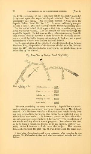| Keywords: The Quarterly journal of the Geological Society of London (12645777643).jpg 28 <br> PROCEEDINGS OF THE GEOLOGICAL SOCIETY Nov 5 <br> p 276 specimens of the yellowish sandy material marked d <br> lying next upon the vegetable deposit obtained from that shaft <br> accompany this paper See specimen marked Next upon the <br> deposit Dalton Road Pit No 1 It seems sufficiently compact <br> to form a cavity See also other specimens from neighbouring pits <br> In the end of this drift it appears that this yellowish sandy ma- <br> terial was never reached The last man in did not cut through the <br> vegetable deposit He informs me that before abandoning the drift <br> they worked directly upwards a short distance in the hope of find- <br> ing ore until the lights became extinguished by bad air and a great <br> accumulation of wood was the last material found <br> In the ground-plan of this pit fig 3 kindly furnished by Edward <br> VVadham Esq the position of the iron-ore alluded to in Mr Bolton's <br> paper p 277 likewise indicates a cavern in the pinel filled in at <br> some time by the mineral <br> Fig 3 ” Flan of Dalton Road Pit 1862 <br> Pinel in the face of the <br> workings <br> Soft limestone <br> Pinel <br> ˘ VWF'iA <br> Inferior ore <br> 0 t -Jo <br> Blue clay and sand <br> ˘ muni <br> ˘ mml <br> The adit containing the peaty or woody deposit lies in a north- <br> easterly direction ” not exactly north as represented in Mr Bolton's <br> section Mr Wadham remarks The plan now sent is chiefly from <br> my own recollection the proper plan having been neglected when it <br> should have been made ; it is however correct so far as the differ- <br> ent substances are concerned for I have a very vivid recollection of <br> the whole working when it was in progress Your view of the case <br> as to its being a cavernous deposit is in my opinion perfectly cor- <br> rect ; in fact I have not a doubt upon the subject The iron-ore <br> too as shown upon the plan fig 3 was deposited in the same way <br> On a piece of the deposit-wood in my possession after removing the blue <br> pigment Dr Walker- Arnott discovered what he considered to be the mark of a <br> hatchet 35327979 109632 51125 Page 28 Text v 19 http //www biodiversitylibrary org/page/35327979 1863 Geological Society of London Biodiversity Heritage Library The Quarterly journal of the Geological Society of London v 19 1863 Geology Periodicals Smithsonian Libraries bhl page 35327979 dc identifier http //biodiversitylibrary org/page/35327979 smithsonian libraries Information field Flickr posted date ISOdate 2014-02-20 Check categories 2015 August 26 CC-BY-2 0 BioDivLibrary https //flickr com/photos/61021753 N02/12645777643 2015-08-27 10 51 58 cc-by-2 0 PD-old-70-1923 The Quarterly journal of the Geological Society of London 1863 Photos uploaded from Flickr by Fæ using a script |