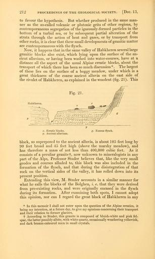 | Keywords: The Quarterly journal of the Geological Society of London (12645637094).jpg 212 PROCEEDINGS OF THE GEOLOGICAL SOCIETY DcC 13 <br> to favour the hypothesis But whether produced in the same man- <br> ner as the so-called volcanic or plutonic grits of other regions by <br> contemporaneous segregation of the igneously-formed particles in the <br> bottom of a turbid sea or by subsequent partial alteration of the <br> strata through the action of heat and gases or by transport from <br> other rocks it is clear that these small developments of granitic matter <br> are contemporaneous with the flysch <br> Now it happens that in the same valley of Habkheren several large <br> granitic blocks also exist which lying upon the surface of the an- <br> cient alluvium or having been washed into water-courses have at a <br> distance all the aspect of the usual Alpine erratic blocks about the <br> transport of which there has been so much discussion The largest <br> of these lies on the surface of a boggy meadow under which is a <br> great thickness of the coarse ancient alluvia on the east side of <br> the rivulet of Habkheren as explained in the woodcut fig 21 This <br> Habkheren <br> X Erratic blocks <br> 7/ Ancient alluvium <br> g Eocene flysch <br> block so superposed to the ancient alluvia is about 105 feet long by <br> 90 feet broad and 45 feet high above the marshy meadow and <br> has therefore a mass of not less than 400 000 cubic feet As it <br> consists of a peculiar granite f now unknown to mineralogists in any <br> part of the Alps Professor Studer believes that like the very small <br> geodes and courses alluded to this block was also included in the <br> formation of the flysch and that during the disintegration of that <br> rock on the vertical sides of the valley it has rolled down into its <br> present position <br> Extending this view M Studer accounts in a similar manner for <br> what he calls the blocks of the Bolghen i e that they were derived <br> from pre-existing rocks and were originally encased in the flysch <br> during its formation After examining both spots I cannot adopt <br> this opinion nor can I regard the great block of Habkheren in any <br> In this memoir I shall not enter upon the question of the Alpine erratics it <br> being my intention at a future day to give my opinions concerning their transport <br> and their relation to former glaciers <br> t According to Studer this granite is composed of bluish-white and pink fel- <br> spar the latter possibly albite with white quartz occasionally weathering yellowish <br> and dark bronze-coloured mica in small crystals 35268856 109512 51125 Page 212 Text v 5 http //www biodiversitylibrary org/page/35268856 1849 Geological Society of London Biodiversity Heritage Library The Quarterly journal of the Geological Society of London v 5 1849 Geology Periodicals Smithsonian Libraries bhl page 35268856 dc identifier http //biodiversitylibrary org/page/35268856 smithsonian libraries Information field Flickr posted date ISOdate 2014-02-20 Check categories 2015 August 26 CC-BY-2 0 BioDivLibrary https //flickr com/photos/61021753 N02/12645637094 2015-08-27 10 53 04 cc-by-2 0 PD-old-70-1923 The Quarterly journal of the Geological Society of London 1849 Photos uploaded from Flickr by Fæ using a script |