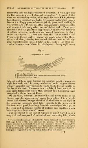 | Keywords: The Quarterly journal of the Geological Society of London (12645132115).jpg 1848 MURCHISON ON THE STRUCTURE OF THE ALPS 191 <br> remarkably bold and highly dislocated mountain From a spot near <br> the Esel summit where I observed nummulites I perceived that <br> there was an ascending section with a rapid dip to the S S E through <br> beds of impure limestone into highly ferruginous strata which in parts <br> became a strikingly green calcareous grit in parts small pisolitic in <br> which were casts of Pectens and other shells similar to those associated <br> with nummulites in many other parts of Switzerland These green <br> sandstones and calc grits there dipped rapidly under a vast thickness <br> of schists micaceous sandstones and bastard limestones ; in short <br> imder the 'flysch It was thus clear that the nummulitic and <br> flysch rocks though perfectly united and conformable within them- <br> selves and clearly forming one natural division were at this high <br> gorge unconformably enclosed between two walls of the older neo- <br> comian limestone as exhibited in this diagram In my rapid survey <br> Fig 8 <br> Gorge east of Mt Pilatus <br> g Flysch of great thickness <br> / Ferruginous greensand with Pectens part of the nummulitic group <br> b Neocomian limestone upper <br> I did not visit the adjacent flanks of the mountain in which a sequence <br> might be found ; and I have only to observe that in the great masses <br> of finely laminated marly and sandy schists which descend rapidly on <br> the face of the older limestones into the lake I found some of the <br> same small foraminifera which MM Briinner and Riittimeyer have <br> recognized in the environs of Thun <br> On the whole however the nummulitic and flysch rocks of the <br> Pilatus have the appearance of having been upheaved in a highly <br> broken and elevated trough the sides of which rest on the edges of <br> the neocomian limestone which latter presents to the north one of <br> the finest mural precipices along the whole outer edge of the Alps to <br> the lower and undulating country of molasse and nagelflue which <br> here range over the canton of Lucerne <br> The eastern end of the lake of Alpnach is almost barred in by a <br> tongue of land composed of subcorneal and undulating hills which <br> The species of nummulite I found in the Pilatus was small but it is well known <br> that large forms of this genus are there also present In reference to these <br> organic remains I ascertained when in the company of Professor Briinner how <br> much the species of Nummulites and other Foraminifera differ in the same region <br> at different localities and yet as will hereafter be seen the very same character- <br> istic species reappear at spots very widely distant from each other <br> p2 35268835 109512 51125 Page 191 Text v 5 http //www biodiversitylibrary org/page/35268835 1849 Geological Society of London NameFound Foraminifera NameConfirmed Foraminifera EOLID 2869058 NameBankID 5953016 NameFound Nummulites NameConfirmed Nummulites EOLID 6817785 NameBankID 3399048 NameFound Pilatus Biodiversity Heritage Library The Quarterly journal of the Geological Society of London v 5 1849 Geology Periodicals Smithsonian Libraries bhl page 35268835 dc identifier http //biodiversitylibrary org/page/35268835 smithsonian libraries Information field Flickr posted date ISOdate 2014-02-20 Check categories 2015 August 26 CC-BY-2 0 BioDivLibrary https //flickr com/photos/61021753 N02/12645132115 2015-08-27 10 59 22 cc-by-2 0 PD-old-70-1923 The Quarterly journal of the Geological Society of London 1849 Photos uploaded from Flickr by Fæ using a script |