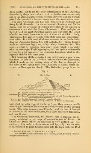 | Keywords: The Quarterly journal of the Geological Society of London (12645008385).jpg 1848 MURCHISON ON THE STRUCTURE OF THE ALPS <br> 181 <br> Buch pointed out to me the clear determination of the Oxfordian <br> formation by the presence of several of the fossils above enumerated ; <br> and in the grand natural sections between Rovereto and the Corneto <br> pass I also perceived a fine succession under the Ammonitico rosso <br> The same Oxfordian zone has been delineated in Piedmont and <br> Savoy by M Sismonda In the environs of Chambery and Aix les <br> Bains I had the advantage of studying its relation to the superior or <br> cretaceous strata with the Canon Chamousset That geologist has <br> there divided the great Oxfordian masses into four parts the lowest <br> of which are marly limestones in beds of about a foot thick 2ndly <br> Limestones deep grey or bluish with white veins and some ferrugi- <br> nous oolite It is this band which contains most of the fossils inclu- <br> ding the Ammonites biplex c with Aptychi c 3rdly Foliated <br> marls or calcareous flags ; and 4thly Marly limestone c This <br> zone is overlaid by limestone with many corals which is paralleled <br> with the coral rag of English geologists and that again is conformably <br> overlaid by a full expanse of the neocomian formation which in this <br> region is divisible into three parts <br> Not describing all these strata I here merely annex a general sec- <br> tion from the base of the Oxfordian to the summit of the Neocomian <br> which I made on the western shore of the Lac de Bourget on <br> the sides of the zigzag road from Chambery to Lyons which tra- <br> verses the Montague du Chatf This Oxfordian group forms the <br> w <br> Fig 3 <br> Mt du Chat <br> Lake of <br> Bourget <br> Cretaceous <br> Upper Neocomian limestone with Chama ammonia <br> Middle Neocomian with Spatangus retusus <br> Lower Neocomian greenish ferruginous calc grit with Ostrece Pectens c <br> base of EngUsh Lower greensand <br> Coralline limestone Coral rag Summits dolomitic <br> Oxfordian Jura with Kelloway rock fossils 2 Schists and limestones <br> f 3 <br> Jurassic ' <br> base of all the outer edges of the Savoy Alps ; their summits usually <br> consisting of neocomian limestone and often covered by still younger <br> rocks This order is seen around Chambery and the lake of Bourget <br> at Annecy in the valley of the Arve both above and below Sallenches <br> and near Geneva <br> The Oxfordian limestones but without such a capping are co- <br> piously exhibited in the range of mountains east of Vevey At <br> Chatel St Denis where the limestone is very mottled and con- <br> cretionary it is loaded with ammonites and Aptychi ; and the same <br> rock subjected to great flexures rises into the high peak the Dent <br> t See Bull Geol Soc Fr new ser t i pi 9 fig 3 <br> X I was directed to these limestones by M Studer and M Collon of Vevey ac- <br> companied me thither 35268825 109512 51125 Page 181 Text v 5 http //www biodiversitylibrary org/page/35268825 1849 Geological Society of London NameFound Aix NameConfirmed Aix EOLID 104240 NameBankID 2474092 NameFound Ammonites biplex NameConfirmed Ammonites biplex NameFound Chama ammonia NameFound Spatangus retusus Biodiversity Heritage Library The Quarterly journal of the Geological Society of London v 5 1849 Geology Periodicals Smithsonian Libraries bhl page 35268825 dc identifier http //biodiversitylibrary org/page/35268825 smithsonian libraries Information field Flickr posted date ISOdate 2014-02-20 Check categories 2015 August 26 CC-BY-2 0 BioDivLibrary https //flickr com/photos/61021753 N02/12645008385 2015-08-27 10 58 27 cc-by-2 0 PD-old-70-1923 The Quarterly journal of the Geological Society of London 1849 Photos uploaded from Flickr by Fæ using a script |