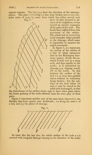| Keywords: The Quarterly journal of the Geological Society of London (12644983705).jpg 1848 <br> SHARPE ON SLATY CLEAVAGE <br> 119 <br> organic remains The lines y y show the direction of the cleavage- <br> planes The plane of bedding a a has been broken into a very irre- <br> gular series of steps by some force which has either moved each <br> sheet of slate forward in ad- <br> vance of its neighbour or has <br> caused an uneven expansion <br> of the parts of the rock The <br> fossils have suffered from this <br> movement of the surface <br> The whole bed is covered by <br> small irregular ridges parallel <br> to the cleavage which make <br> it impossible to measure the <br> angles accurately <br> In figure 7 « « represents <br> the section of the surface of <br> a bed of black calcareous <br> slate in the Bickington lime- <br> stone quarry North Devon <br> which is bent over in a steep <br> arch and dips rapidly to the <br> north ; it is intersected by <br> cleavage y y dipping nearly <br> 70° to the south In this <br> instance the surface of the <br> bed « a is bent into parallel <br> waves without its continuity <br> being broken but the out- <br> lines of the beds below h h <br> and c c may be traced in the <br> solid rock unchanged; so that <br> the disturbance of the surface seems only to have taken place where <br> the looser packing of the rocks allowed room for some play of their <br> parts <br> Figure 8 represents another case of the same kind observed in the <br> Brathay flag-stone quarry near Ambleside ; a a being the surfr ee of <br> a bed and yy the planes of cleavage <br> In cases like the last two the whole surface of the beds a a is <br> covered with irregular flutings running in the direction of the strike 35268761 109512 51125 Page 119 Text v 5 http //www biodiversitylibrary org/page/35268761 1849 Geological Society of London Biodiversity Heritage Library The Quarterly journal of the Geological Society of London v 5 1849 Geology Periodicals Smithsonian Libraries bhl page 35268761 dc identifier http //biodiversitylibrary org/page/35268761 smithsonian libraries Information field Flickr posted date ISOdate 2014-02-20 Check categories 2015 August 26 CC-BY-2 0 BioDivLibrary https //flickr com/photos/61021753 N02/12644983705 2015-08-27 10 57 06 cc-by-2 0 PD-old-70-1923 The Quarterly journal of the Geological Society of London 1849 Photos uploaded from Flickr by Fæ using a script |