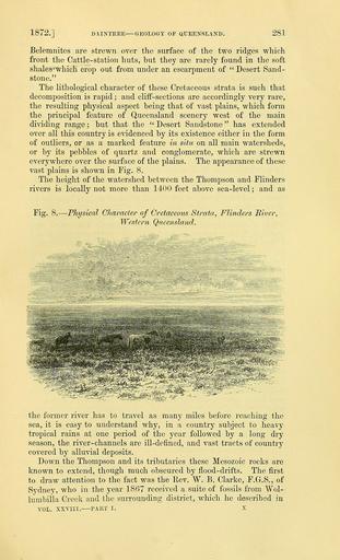 Keywords: The Quarterly journal of the Geological Society of London (12513300434).jpg 1872 <br> DITNTREE GEOLOGY OP aUEENSLAND <br> 281 <br> Belemnites are strewn over the surface of the two ridges which <br> front the Cattle-station huts but they are rarely found in the soft <br> shales 'which crop out from under an escarpment of Desert Sand- <br> stone <br> The lithological character of these Cretaceous strata is such that <br> decomposition is rapid ; and cliff-sections are accordingly very rare <br> the resulting physical aspect being that of vast plains which form <br> the principal feature of Queensland scenery west of the main <br> dividing range ; but that the Desert Sandstone has extended <br> over all this country is evidenced by its existence either in the form <br> of outliers or as a marked feature in situ on all main watersheds <br> or by its pebbles of quartz and conglomerate which are strewn <br> everywhere over the surface of the plains The appearance of these <br> vast plains is shown in Pig 8 <br> The height of the watershed between the Thompson and Flinders <br> rivers is locally not more than 1400 feet above sea-level ; and as <br> Fig 8 ” Physical Character of Cretaceous Strata Flinders River <br> Western Queensland <br> the former river has to travel as many miles before reaching the <br> sea it is easy to understand why in a country subject to heavy <br> tropical rains at one period of the year followed by a long dry <br> season the river-channels are ill-defined and vast tracts of country <br> covered by alluvial deposits <br> Down the Thompson and its tributaries these Mesozoic rocks are <br> known to extend though much obscured by flood-drifts The first <br> to draw attention to the fact was the Rev W B Clarke F G S of <br> Sydney who in the year 1867 received a suite of fossils from VVol- <br> lurabilla Creek and the surrounding district which he described in <br> VOL XXVIII PAKT I X 34985294 108770 51125 Page 281 Text v 28 http //www biodiversitylibrary org/page/34985294 1872 Geological Society of London NameFound Belemnites NameConfirmed Belemnites EOLID 4780330 NameBankID 4089090 Biodiversity Heritage Library The Quarterly journal of the Geological Society of London v 28 1872 Geology Periodicals Smithsonian Libraries bhl page 34985294 dc identifier http //biodiversitylibrary org/page/34985294 smithsonian libraries Information field Flickr posted date ISOdate 2014-02-14 Check categories 2015 August 26 CC-BY-2 0 BioDivLibrary https //flickr com/photos/61021753 N02/12513300434 2015-08-27 09 59 21 cc-by-2 0 PD-old-70-1923 The Quarterly journal of the Geological Society of London 1872 Photos uploaded from Flickr by Fæ using a script