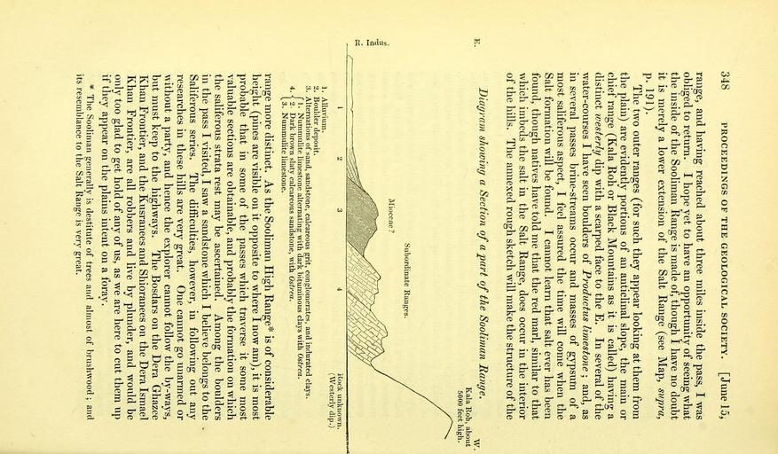 | Keywords: The Quarterly journal of the Geological Society of London (12511986485).jpg 348 PROCEEDINGS OF THE GEOLOGICAL SOCIETY June 15 <br> range and having reached about three miles inside the pass I was <br> obliged to return I hope yet to have an opportunity of seeing what <br> the inside of the Sooliman Range is made of though I have no doubt <br> it is merely a lower extension of the Salt Range see Map supra <br> p 191 <br> The two outer ranges for such they appear looking at them from <br> the plain are evidently portions of an anticlinal slope the main or <br> chief range Kala Roh or Black Mountains as it is called having a <br> distinct ivesterly dip with a scarped face to the E In several of the <br> water-courses I have seen boulders of Productus limestone ; and as <br> in several passes brine-streams occur and masses of gypsutti of a <br> most saliferous aspect I feel assured the time will come when the <br> Salt formation will be found I cannot learn that salt ever has been <br> found though natives have told me that the red marl similar to that <br> which imbeds the salt in the Salt Range does occur in the interior <br> of the hills The annexed rough sketch will make the structure of the <br> Diagram showing a Section of a part of the Sooliman Range <br> Kala Rob about <br> 5000 feet high <br> 12 3 4 iiock unknown <br> Westerly dip <br> 1 Alluvium <br> 2 Boulder deposit <br> 3 Alternations of sand sandstone calcareous grit conglomerates and indurated clays <br> I 1 Nummulite limestone alternating with dark bituminous clays with Ostrea <br> 4 2 Dark brown slaty calcareous sandstone with Ostrea <br> 1 3 Nummulite limestone <br> range more distinct As the Sooliman High Range is of considerable <br> height pines are visible on it opposite to where I now am it is most <br> probable that in some of the passes which traverse it some most <br> valuable sections are obtainable and probably the formation on which <br> the saliferous strata rest may be ascertained Among the boulders <br> in the pass I visited I saw a sandstone which I believe belongs to the <br> Saliferous series The difficulties however in following out any <br> researches in these hills are very great One cannot go unarmed or <br> without a party and hence the explorer cannot follow the by-ways <br> but must keep to the highways The Bosdars on the Dera Ghazee <br> Khan Frontier and the Kusranees and Shioranees on the Dera Ismael <br> Khan Frontier are all robbers and live by plunder and would be <br> only too glad to get hold of any of us as we are here to cut them up <br> if they appear on the plains intent on a foray <br> The Sooliman generally is destitute of trees and almost of brushwood ; and <br> its resemblance to the Salt Range is very great 34983481 108767 51125 Page 348 Text v 9 http //www biodiversitylibrary org/page/34983481 1853 Geological Society of London NameFound Dera NameConfirmed Dera NameBankID 4139169 NameFound Ostrea NameConfirmed Ostrea EOLID 10719983 NameBankID 2692450 NameFound Productus NameConfirmed Productus NameBankID 4310929 Biodiversity Heritage Library The Quarterly journal of the Geological Society of London v 9 1853 Geology Periodicals Smithsonian Libraries bhl page 34983481 dc identifier http //biodiversitylibrary org/page/34983481 smithsonian libraries Information field Flickr posted date ISOdate 2014-02-14 Check categories 2015 August 26 CC-BY-2 0 BioDivLibrary https //flickr com/photos/61021753 N02/12511986485 2015-08-27 09 54 09 cc-by-2 0 PD-old-70-1923 The Quarterly journal of the Geological Society of London 1853 Photos uploaded from Flickr by Fæ using a script |