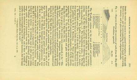 | Keywords: The Quarterly journal of the Geological Society of London (12511918805).jpg of these well- <br> known sections ; and the accompanying sketch is simply used to help <br> the memory and to give coherence to the subjoined remarks <br> Fig 3 Diagram showing the succession of rocks from the May Hill <br> Sandstone upwards <br> S W May Hill N E <br> 1 Coal-iield of the Forest of Dean <br> 2 Mountain limestone <br> 3 Old Red Sandstone <br> 4 Upper Ludlow <br> 5 Aymestry limestone <br> 6 Lower Ludlow <br> 7 Wenlock limestone <br> 8 Wenlock shale <br> g Woolhope limestone <br> 10 May Hill sandstone <br> The Woolhope sections are the most perfect and symmetrical ; <br> but the May Hill section was best for our purpose ; viz to examine <br> and connect together the two groups which are at the base of the <br> section In the May Hill section we have the following groups in <br> true descending order 1 The Carboniferous series ; 2 The Old- <br> red-sandstone ; 3 The Ludlow series Nos 4 5 6 of the sketch ; <br> 4 The Wenlock series Nos 7 8 of the sketch Respecting these <br> four groups there has been no doubt since the Silurian Sections were <br> first published by Sir R I Murchison 5 These groups are fol- <br> lowed by thin bands of concretionary limestone No 9 of the sketch <br> separating the base of the Wenlock shales from the underlying grits <br> of May Hill 6 The shelly sandstones and grits which form the <br> dome-like elevation of May Hill No 10 <br> The last two groups of this section were considered in the Silu- <br> rian System as Caradoc sandstone Subsequent labourers espe- <br> cially Professor Phillips have pointed out good reasons for regarding <br> the bands of concretionary limestone as an integral part of the Wenlock <br> series ; but he and the other Government Surveyors have coloured and <br> described the May Hill grits c as Caradoc sandstone <br> The bands of limestone last mentioned might I think be most <br> conveniently called Lower Wenlock limestone ; but the name Wool- <br> hope limestone having for some time passed current I will here <br> adopt it All the Silurian limestones are local phsenomena ; none <br> of them are so persistent as to offer good terms of comparison be- <br> tween countries of the same age which are widely separated This <br> remark applies with all its force to the Woolhope limestone Round <br> May Hill it is in many places so degenerate as to have been over- <br> looked in the sections At Littlehope and in other places within <br> the Woolhope elevation it is more clearly developed and cannot <br> escape notice as it is extensively burnt for lime At Presteign it <br> reaches its maximum of development ; and it there so entirely re- <br> sembles the most complete form of Wenlock limestone that for many <br> years it was confounded with that rock <br> See Quart Journ Geol Soc vol vi p 435 <br> VOL IX PART I Q 34983332 108767 51125 Page 219 Text v 9 http //www biodiversitylibrary org/page/34983332 1853 Geological Society of London Biodiversity Heritage Library The Quarterly journal of the Geological Society of London v 9 1853 Geology Periodicals Smithsonian Libraries bhl page 34983332 dc identifier http //biodiversitylibrary org/page/34983332 smithsonian libraries Information field Flickr posted date ISOdate 2014-02-14 Check categories 2015 August 26 CC-BY-2 0 BioDivLibrary https //flickr com/photos/61021753 N02/12511918805 2015-08-27 09 56 52 cc-by-2 0 PD-old-70-1923 The Quarterly journal of the Geological Society of London 1853 Photos uploaded from Flickr by FĂŚ using a script |