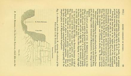 | Keywords: The Quarterly journal of the Geological Society of London (12511800315).jpg 1853 <br> BIGSBY GEOLOGY OF aUEBEC <br> 89 <br> argillaceous and quartzose loses nearly all its fossils and assumes <br> a soft shaly structure with a high dip to the S E the same which <br> prevails for more than 100 miles in every direction but due north <br> Looking up from below at the higher parts of this bowl-shaped <br> chasm on the east side we see peeping from beneath rubbish and <br> among shrubbery displaced slabs of compact Trenton limestone fol- <br> lowed downwards by dark shales while the lower parts of the preci- <br> pice and the beach of the River St Lawrence are wholly occupied by <br> Utica slate in the full development of its crumbling rusty brown <br> shales its Graptolites and Triarthrus Beckii the Trenton fossils <br> having disappeared <br> Beauport Continuing our observations both on the Trenton lime- <br> stone and its connexion with Utica slate it is to be noted that at Beau- <br> port the village a little westward of Montmorenci the change is well <br> displayed <br> Two hundred yards north of Col de Salaberry's house in this <br> village we have in a quarry the genuine horizontal Trenton limestone <br> At oxAj ffty yards north of the house ' it is interstratified largely <br> with black shale and with a slight dip In the streamlet close to <br> the house the rock is the true Utica slate dipping at a high angle <br> to the S E Capt Skene R E <br> In the quarries about this village the Trenton limestone is full of <br> shale often coated with fluor-spar copper pyrites and calcedony <br> The bituminous druses are numerous and often of the size of a <br> walnut Its fossils are scattered in patches ; sometimes they are <br> altogether absent at others in inconceivable quantities Some of <br> the shaly layers are wholly composed of Trilobites especially of the <br> Asaphus gigas or oi Rhynchonella hemiplicata <br> Fig 3 Section at Petite Ruisseau R showing the relation of the <br> Utica slate to the Trenton limestone <br> Trenton limestone <br> Talus c <br> R Petite Ruisseau On the Petite Ruisseau Avhich falls into the 34983192 108767 51125 Page 89 Text v 9 http //www biodiversitylibrary org/page/34983192 1853 Geological Society of London NameFound Asaphus gigas NameConfirmed Asaphus I gigas Reed NameFound Graptolites NameConfirmed Graptolites NameBankID 423327 NameFound Rhynchonella NameConfirmed Rhynchonella EOLID 4328553 NameBankID 4331849 NameFound Triarthrus NameConfirmed Triarthrus EOLID 4324679 NameBankID 2875648 Biodiversity Heritage Library The Quarterly journal of the Geological Society of London v 9 1853 Geology Periodicals Smithsonian Libraries bhl page 34983192 dc identifier http //biodiversitylibrary org/page/34983192 smithsonian libraries Information field Flickr posted date ISOdate 2014-02-14 Check categories 2015 August 26 CC-BY-2 0 BioDivLibrary https //flickr com/photos/61021753 N02/12511800315 2015-08-27 10 00 22 cc-by-2 0 PD-old-70-1923 The Quarterly journal of the Geological Society of London 1853 Photos uploaded from Flickr by FĂŚ using a script |