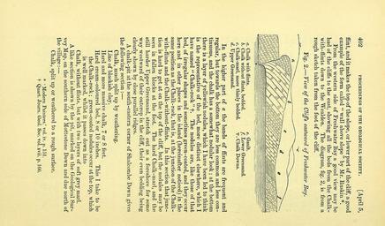 | Keywords: The Quarterly journal of the Geological Society of London (12471273733).jpg 402 <br> PROCEEDINGS OF THE GEOLOGICAL SOCIETY April 5 <br> flint and it makes the top of the slope or lower part of the cliif a good <br> example of the form called wall above slope by Mr Buskin <br> Prom the western side of Freshwater Bay a good view may be <br> had of the cUiFs to the east showing all the beds from the Chalk- <br> with-flints down to the Wealden The diagram fig 2 is from a <br> rough sketch taken from the foot of the cliff <br> Fig 2 ” View of the Cliff's eastward of Freshwater Bay <br> a Chalk with flints e Gault <br> h Chalk without flints bedded f Lower Greensand <br> c Chalk-marl more thinly bedded r Chalk Downs <br> d Upper Greensand <br> In the higher part of a the bands of flints are frequent and <br> regular but towards the bottom they are less common and less con- <br> tinuous and the chalk has a somewhat nodular look ; at the bottom <br> there is a layer of yellowish nodules which I have been led to think <br> is the representative of the bed more distinct elsewhere which I <br> have named Chalk- rock f The nodules are like those of that <br> bed of irregular shapes and sometimes green-coated and they occur <br> here and in other places in the island hereinafter noticed in the <br> same position as the Chalk-rock that is at the junction of the Chalk- <br> with-flints and the Chalk- without-flints In this section that junc- <br> tion is hard to get at on the top of the cliff but the nodules may be <br> seen in fallen blocks at the foot The hard Chalk-marl and the <br> still harder Upper Greensand stretch out as a foreshore for some <br> way westward of their outcrop in the chff their even bedding being <br> clearly shown by close parallel ridges <br> A chalk-pit at the south-eastern corner of Shalcombe Down gives <br> the following section ; ” <br> Chalk much split up by weathering <br> Line of blackish clay <br> Hard and more massive chalk 7 or 8 feet <br> Hard cream-coloured bed 8 or 10 inches This I take to be <br> the Chalk -rock ; green-coated nodules occur at the top which <br> is well marked whilst it passes down into <br> Chalk without flints but with two layers of soft grey marl <br> A like section is shown by the pit marked on the Geological Sur- <br> vey Map on the southern side of Mottestone Down and due north of <br> the village ” <br> Chalk split up or weathered to a rough surface <br> ' Modern Painters ' vol iv p 151 <br> t Quart Joiu n Geol Soc vol xvii p 166 <br> I 34892076 108495 51125 Page 402 Text v 21 http //www biodiversitylibrary org/page/34892076 1865 Geological Society of London Biodiversity Heritage Library The Quarterly journal of the Geological Society of London v 21 1865 Geology Periodicals Smithsonian Libraries bhl page 34892076 dc identifier http //biodiversitylibrary org/page/34892076 smithsonian libraries Information field Flickr posted date ISOdate 2014-02-12 Check categories 2015 August 26 CC-BY-2 0 BioDivLibrary https //flickr com/photos/61021753 N02/12471273733 2015-08-27 10 02 33 cc-by-2 0 PD-old-70-1923 The Quarterly journal of the Geological Society of London 1865 Photos uploaded from Flickr by Fæ using a script |
