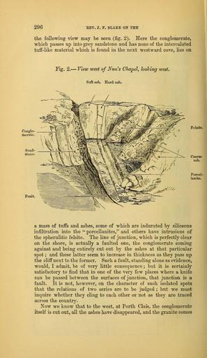 Keywords: The Quarterly journal of the Geological Society of London (13889211520).jpg 296 <br> EEY J r BLAKE ON THE <br> the following view may be seen fig 2 Here the conglomerate <br> which passes up into grey sandstone and has none of the intercalated <br> tuff-like material which is found in the next westward cove lies on <br> rig 2 ” View west of Nun s CTiapel looking west <br> Soft ash Hard ash <br> Fault <br> Conglo- J ' <br> merate P\ Bl <br> Sand <br> stone \\\ <br> Telsite <br> Coarse <br> ash <br> Porcel- <br> lanite <br> a mass of tuffs and ashes some of which are indurated hy siliceous <br> infiltration into the porcellanites and others have intrusions of <br> the spheruhtic f elsite The line of junction which is perfectly clear <br> on the shore is actually a faulted one the conglomerate coming <br> against and being entirely cut out by the ashes at that particular <br> spot ; and these latter seem to increase in thickness as they pass up <br> the cliff next to the former Such a fault standing alone as evidence <br> would I admit be of very little consequence ; but it is certainly <br> satisfactory to find that in one of the very few places where a knife <br> can be passed between the surfaces of junction that junction is a <br> fault It is not however on the character of such isolated spots <br> that the relations of two series are to be judged ; but we must <br> inquire whether they cling to each other or not as they are traced <br> across the country <br> Now we know that to the west at Forth Clais the conglomerate <br> itself is cut out all the ashes have disappeared and the granite comes <br> i <br> \ 36941089 113697 51125 Page 296 Text 40 http //www biodiversitylibrary org/page/36941089 1884 Geological Society of London Biodiversity Heritage Library The Quarterly journal of the Geological Society of London v 40 1884 Geology Periodicals Smithsonian Libraries bhl page 36941089 dc identifier http //biodiversitylibrary org/page/36941089 smithsonian libraries Information field Flickr posted date ISOdate 2014-04-30 Check categories 2015 August 26 CC-BY-2 0 BioDivLibrary https //flickr com/photos/61021753 N02/13889211520 2015-08-26 05 52 57 cc-by-2 0 PD-old-70-1923 The Quarterly journal of the Geological Society of London 1884 Photos uploaded from Flickr by Fæ using a script |