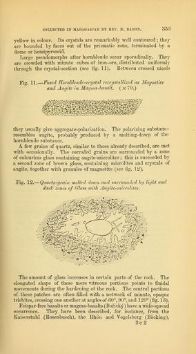 | Keywords: The Quarterly journal of the Geological Society of London (13960399383).jpg COLLECTED IN MADAGASCAR BY REV R BARON 355 <br> phyritic crystals The presence of hornblende in the original magma <br> is marked by pseudomorphs of iron-ore <br> Andesitic lavas occur at Andranonatoha and on a hill in the <br> volcanic region to the west of Lake Itasy They are of a darker <br> colour than the trachytes namely greyish brown They contain <br> striated felspar which generally gives lath-shaped sections but also <br> occurs in large irregular masses imbedded in a ground-mass com- <br> posed of prisms of yellowish-green augite granules of magnetite <br> and microlites of felspar A glassy base does not appear to be <br> present unless it be as extremely thin films between the felspars of <br> the ground-mass Large porphyritic crystals of hornblende floated <br> in the molten magma when it was first erupted but they have <br> been converted into granules of iron-ore ; and only small fragments <br> of the original hornblende-substance remain to mark its former <br> presence <br> To summarize briefly we have found the older crystalline series <br> of Madagascar as represented by Mr Baron's collection to consist <br> of foliated rocks which are described as granitite-gneiss and tonalite- <br> gneiss and rocks in which no trace of foliation can be detected <br> comprising granite olivine-norite pyroxene-granulite and pyroxenite <br> The majority of the granites are of the granitite type but true granite <br> i e granite with tivo micas also occurs The basic members of the <br> unfoliated series are interesting on account of their striking mineral <br> combinations The clear aspect and bright colouring of their con- <br> stituent grains often make them objects of surpassing beauty when <br> viewed under the microscope Of deeper interest is the fact that <br> these basic types so well known in other areas of crystalline schists <br> ” in Saxony Brittany Scandinavia Scotland and on the Hudson <br> Biver ” constitute in Madagascar as at Kilama-njaro on the adjacent <br> mainland so large a part of the ancient floor on which the sedimentary <br> rocks were laid down and through which the volcanic lavas were <br> erupted <br> The volcanic rocks consist mainly of basaltic types only a few <br> specimens of trachyte and andesite being represented in Mr Baron's <br> collection The basalts vary as regards composition Avith respect <br> to the presence or absence of quartz olivine porphyritic and micro- <br> litic hornblende and biotite One curious type contains idio- <br> morphic crystals of hornblende as a constituent of the ground- <br> mass A felspar-free variety or mag ma-basalt is also represented <br> This rock contains only a small quantity of olivine and is therefore <br> intermediate in composition between the limburgite of Kosenbusch <br> and the augitite of Dolter 36940168 113696 51125 Page 353 Text 45 http //www biodiversitylibrary org/page/36940168 1889 Geological Society of London Biodiversity Heritage Library The Quarterly journal of the Geological Society of London v 45 1889 Geology Periodicals Smithsonian Libraries bhl page 36940168 dc identifier http //biodiversitylibrary org/page/36940168 smithsonian libraries Information field Flickr posted date ISOdate 2014-04-21 Check categories 2015 August 26 CC-BY-2 0 BioDivLibrary https //flickr com/photos/61021753 N02/13960399383 2015-08-26 05 51 06 cc-by-2 0 PD-old-70-1923 The Quarterly journal of the Geological Society of London 1889 Photos uploaded from Flickr by Fæ using a script |