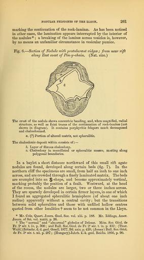 | Keywords: The Quarterly journal of the Geological Society of London (13937127022).jpg NODULAR FELSTONES OE THE LLEYN <br> 263 <br> Near the south-east corner of the Pen-y-chain promontory agate- <br> nodules occur in beds which are much contorted and are appa- <br> rently slaggy lava-flows Some of the nodules are large while <br> others more crowded together vary only from about inch to \ inch <br> across Close by a rock-mass occurs thickly set with small almond- <br> shaped white quartz-nodules usually \ inch or smaller sometimes <br> a hollow shell lined with pyramidal quartz ” white or clear golden <br> These nodules appear under the microscope sharply limited fig 8 <br> Pig 8 ” Diagram of Amygdaloids from old lava-flow at south-east <br> of Pen-y-Chain Enlarged 16 diameters <br> – if V- 'fe 1 <br> T i ' \t' i' -i'- i- y <br> V <br> a <br> W <br> V <br> The amygdaloids are filled mainly with crystalline quartz The outer grains <br> are small ; those of the interior are larger and clearer In one example <br> the cavity is partially empty a The devitrified ground-mass contains <br> remains of porphyritic felspars b <br> although some of the quartz-grains transgress the boundary <br> Radial strise of small enclosures may occur towards the exterior and <br> one example has minute microliths ranged approximately along <br> straight lines in two directions which cross at a high angle The <br> opinion might perhaps be advanced that the rounded nodules are a <br> variety of pseud-amygdals since adjacent structures have a radialized 36940056 113696 51125 Page 261 Text 45 http //www biodiversitylibrary org/page/36940056 1889 Geological Society of London Biodiversity Heritage Library The Quarterly journal of the Geological Society of London v 45 1889 Geology Periodicals Smithsonian Libraries bhl page 36940056 dc identifier http //biodiversitylibrary org/page/36940056 smithsonian libraries Information field Flickr posted date ISOdate 2014-04-21 Check categories 2015 August 26 CC-BY-2 0 BioDivLibrary https //flickr com/photos/61021753 N02/13937127022 2015-08-26 05 55 36 cc-by-2 0 PD-old-70-1923 The Quarterly journal of the Geological Society of London 1889 Photos uploaded from Flickr by Fæ using a script |