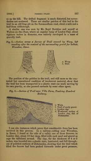 | Keywords: The Quarterly journal of the Geological Society of London (13935640122).jpg 1866 <br> FISHEK WAEP <br> 557 <br> so up the hill The drifted fragment is much distorted but never- <br> theless not scattered There are similar patches of this bed in the <br> trail in an old Crag-pit on the Saxmundham road about a mile and a <br> half from Aldborough <br> A similar case was seen by Mr Boyd Dawkins and myself at <br> Walton-on-the-Naze where an angular lump of London Clay about <br> eighteen inches in diameter was entirely enveloped in a mass of <br> gravelly trail <br> Fig 5 ” Section across a furrow of Trail covered hy Warp left <br> standing after the removal of the surrounding gravel for ballast <br> Wivenhoe Essex <br> a Warp <br> b Trail <br> The position of the pebbles in the trail and still more so the con- <br> torted but unscattered condition of incoherent material show that <br> the trail has been transported in a plastic state as mud moving by <br> its own gravity or else pressed onwards by some other agent <br> Fig 6 ” Section of Trail near Villa Farm Tendring Hundred <br> Railway <br> vj - v – ; - _; - a Warp <br> ;V«/; ' - V ' ' ;'f - b Trail of sandy gravel <br> ;;r - 0;'i - '-V;- v \-v ;T;- 3; ˘ London clay <br> d Weathered surface of <br> London clay full of <br> Slickensides <br> I can cite instances which prove that considerable force has been <br> involved in this process In a railway- cutting near Wivenhoe <br> in Essex I found at the side of a valley one of these farrows in <br> London clay about 13 feet deep filled with such sand and gravel as <br> caps the tableland around The clay for the thickness of 4 or 5 <br> inches was kneaded into a plastic state laminated and full through- <br> out of polished surfaces of slickensides showing that the trail which <br> filled the furrow had been pushed forwards under great pressure 36165010 111477 51125 Page 557 Text v 22 http //www biodiversitylibrary org/page/36165010 1866 Geological Society of London Biodiversity Heritage Library The Quarterly journal of the Geological Society of London v 22 1866 Geology Periodicals Smithsonian Libraries bhl page 36165010 dc identifier http //biodiversitylibrary org/page/36165010 smithsonian libraries Information field Flickr posted date ISOdate 2014-04-21 Check categories 2015 August 26 CC-BY-2 0 BioDivLibrary https //flickr com/photos/61021753 N02/13935640122 2015-08-26 06 52 40 cc-by-2 0 PD-old-70-1923 The Quarterly journal of the Geological Society of London 1866 Photos uploaded from Flickr by Fæ using a script |