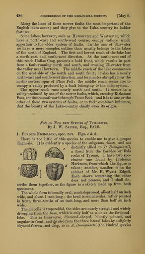 | Keywords: The Quarterly journal of the Geological Society of London (13935590811).jpg 486 PROCEEDINGS OF THE GEOLOGICAL SOCIETY May 9 <br> Along the lines of these newer faults the most important of the <br> English lakes occur ; and they give to the Lake-country its bolder <br> features <br> Some lakes however such as Hawswater and Wastwater which <br> have a north-east and south-west course occupy valleys which <br> appertain to the older system of faults In the case of UUswater <br> we have a more complex outline than usually belongs to the lakes <br> of the north of England The first and lowest reach of the lake has <br> a north-east and south-west direction At the south-west end of <br> this reach Hallan Crag presents a bold front which results in part <br> from a fault running north and south and crossing UUswater from <br> the valley near Howtown The middle reach of the lake commences <br> on the west side of the north and south fault ; it also has a nearly <br> north-east and south-west direction and terminates abruptly near the <br> north-western spur of Place Eell the middle reach seems also to <br> occupy a valley produced by a fault belonging to the older system <br> The upper reach runs nearly north and south It occurs in a <br> valley produced by one of the newer faults which crossing Eirkstone <br> Pass continues southward through Trout Beck ; and it is to one or the <br> other of these two systems of faults or to their combined influence <br> that the beauty of the Lake-country chiefly owes its origin <br> Note on Two new Species of Trilobites <br> By J W Salter Esq E G S <br> 1 Phacops Nicholsoni spec nov Figs c d <br> There is too little of this species to enable me to give a proper <br> diagnosis It is evidently a species of the subgenus Acaste and not <br> distantly allied to P Brongniartii <br> a fossil from the Caradoc or Bala <br> rocks of Tyrone I have two spe- <br> cimens ” one found by Professor <br> Harkness from which the figure is <br> taken; another smaller is in the <br> cabinet of Mr H Wyatt Edgell <br> Each shows something the other <br> does not possess and I shall de- <br> scribe them together as the figure is a sketch made up from both <br> specimens <br> The whole form is broadly oval much depressed about half an inch <br> wide and about 1 inch long ; the head is semicircular rather pointed <br> in front three-tenths of an inch long and more than half an inch <br> wide <br> The glabella is trapezoidal the sides are nearly straight and widely <br> diverging from the base which is only half as wide as the forehead- <br> lobe This is transverse diamond-shaped bluntly pointed and <br> angular in front and divided from the three lateral lobes by a slightly <br> sigmoid furrow not deep as in A Brongniartii the kindred species 36164935 111477 51125 Page 486 Text v 22 http //www biodiversitylibrary org/page/36164935 1866 Geological Society of London NameFound Acaste NameConfirmed Acaste EOLID 4322827 NameBankID 2875674 NameFound Phacops NameConfirmed Phacops EOLID 4322195 NameBankID 2875665 Biodiversity Heritage Library The Quarterly journal of the Geological Society of London v 22 1866 Geology Periodicals Smithsonian Libraries bhl page 36164935 dc identifier http //biodiversitylibrary org/page/36164935 smithsonian libraries Information field Flickr posted date ISOdate 2014-04-21 Check categories 2015 August 26 CC-BY-2 0 BioDivLibrary https //flickr com/photos/61021753 N02/13935590811 2015-08-26 06 57 27 cc-by-2 0 PD-old-70-1923 The Quarterly journal of the Geological Society of London 1866 Photos uploaded from Flickr by Fæ using a script |