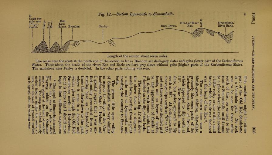 | Keywords: The Quarterly journal of the Geological Society of London (13935516931).jpg 1866 <br> JIJKES OLD BED SANDSTONE AND DEVONIAN <br> 353 <br> This sandstone might be either <br> part of the Old Red Sandstone <br> or a Coomhola grit No rock <br> was to be seen for three miles <br> south of this on or near to the <br> road to Simonsbath until I came <br> to a place where the road crossed <br> a little rocky ravine with a small <br> brook which the driver declared <br> was the head of the Exe <br> The rock shown here was a <br> bluish-grey shining clay-slate <br> precisely like some parts of the <br> Carboniferous Slate of Ireland <br> which appeared to dip south at <br> 10° Near Simonsbath similar <br> slate but paler appeared to dip <br> south at 30° At both places the <br> cleavage dips south at 70° or 75° <br> and as there were no decided grit <br> bands and no layers of fossils <br> or any appearance of fossils at <br> all it was with some doubt that <br> I decided on the dip of the beds <br> The section in fig 12 will show <br> the above facts in a diagram- <br> matic form starting from a point <br> a mile east of Lymmouth and <br> crossing the country to Simons- <br> bath <br> The green little open valley <br> of Simonsbath was very similar <br> in aspect to valleys in the Car- <br> boniferous Slate in Ireland and <br> I greatly regret that I was un- <br> fortunately prevented from re- <br> turning here as I intended to <br> trace the Barle down to the part <br> where it runs in a deeper and <br> wilder glen through the Old Red <br> Sandstone north of Dulverton; <br> for it is there that I should most <br> hope to find sufficient exposures <br> The people at Simonsbath assured <br> me that this was the place called <br> Prayway which on the Ordnance <br> map is placed at the head of another <br> stream The map was indeed nearly <br> useless here as neither the roads ri- <br> vers nor features of ground marked <br> on it agreed with the existing ones 36164794 111477 51125 Page 353 Text v 22 http //www biodiversitylibrary org/page/36164794 1866 Geological Society of London Biodiversity Heritage Library The Quarterly journal of the Geological Society of London v 22 1866 Geology Periodicals Smithsonian Libraries bhl page 36164794 dc identifier http //biodiversitylibrary org/page/36164794 smithsonian libraries Information field Flickr posted date ISOdate 2014-04-21 Check categories 2015 August 26 CC-BY-2 0 BioDivLibrary https //flickr com/photos/61021753 N02/13935516931 2015-08-26 06 57 01 cc-by-2 0 PD-old-70-1923 The Quarterly journal of the Geological Society of London 1866 Photos uploaded from Flickr by Fæ using a script |