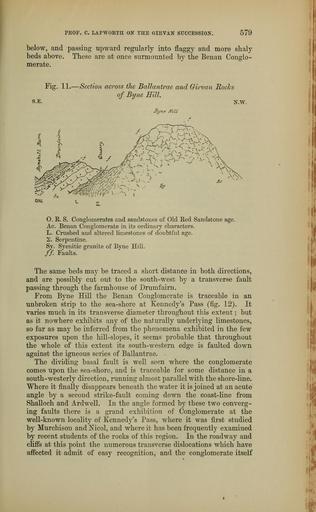| Keywords: The Quarterly journal of the Geological Society of London (13860382924).jpg PEOP C LAPWORTH ON THE GIEVAN SUCCESSION <br> 579 <br> below and passing upward regularly into flaggy and more shaly <br> beds above These are at once surmounted by the Benan Conglo- <br> merate <br> Fig 11 ” Section across the Ballantrae and Girvan Rocks <br> of Byne Hill <br> S E <br> N W <br> Byne MU <br> / <br> OJte <br> O K S Conglomerates and sandstones of Old Eed Sandstone age <br> Ac Benan Conglomerate in its ordinary characters <br> L Crushed and altered limestones of doubtful age <br> 2 Serpentine <br> Sy Syenitic granite of Byne Hill <br> // Faults <br> The same beds may be traced a short distance in both directions <br> and are possibly cut out to the south-west by a transverse fault <br> passing through the farmhouse of Drumfairn <br> From Byne Hill the Benan Conglomerate is traceable in an <br> unbroken strip to the sea-shore at Kennedy's Pass fig 12 It <br> varies much in its transverse diameter throughout this extent ; but <br> as it nowhere exhibits any of the naturally underlying limestones <br> so far as may be inferred from the phenomena exhibited in the few <br> exposures upon the hill-slopes it seems probable that throughout <br> the whole of this extent its south-western edge is faulted down <br> against the igneous series of Ballantrae <br> The dividing basal fault is well seen where the conglomerate <br> comes upon the sea-shore and is traceable for some distance in a <br> south-westerly direction running almost parallel with the shore-line <br> Where it finally disappears beneath the water it is joined at an acute <br> angle by a second strike-fault coming down the coast-line from <br> Shalloch and Ardwell In the angle formed by these two converg- <br> ing faults there is a grand exhibition of Conglomerate at the <br> well-known locality of Kennedy's Pass where it was first studied <br> by Murchison and Nicol and where it has been frequently examined <br> by recent students of the rocks of this region In the roadway and <br> cliffs at this point the numerous transverse dislocations which have <br> affected it admit of easy recognition and the conglomerate itself 36936408 113692 51125 Page 579 Text 38 http //www biodiversitylibrary org/page/36936408 1882 Geological Society of London Biodiversity Heritage Library The Quarterly journal of the Geological Society of London v 38 1882 Geology Periodicals Smithsonian Libraries bhl page 36936408 dc identifier http //biodiversitylibrary org/page/36936408 smithsonian libraries Information field Flickr posted date ISOdate 2014-04-15 Check categories 2015 August 26 CC-BY-2 0 BioDivLibrary https //flickr com/photos/61021753 N02/13860382924 2015-08-26 07 52 01 cc-by-2 0 PD-old-70-1923 The Quarterly journal of the Geological Society of London 1882 Photos uploaded from Flickr by Fæ using a script |