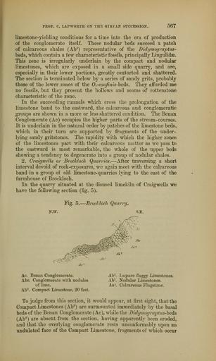 | Keywords: The Quarterly journal of the Geological Society of London (13860367334).jpg PROF C LAPWORTH OX THE GIRYAN SUCCESSION <br> bQ\ <br> limestone-yielding conditions for a time into the era of production <br> of the conglomerate itself These nodular beds succeed a patch <br> of calcareous shales Ab 4 representative of the Didymograptus- <br> beds which contain a few characteristic fossils principally Lingulidae <br> This zone is irregularly underlain by the compact and nodular <br> limestones which are exposed in a small side quarry and are <br> especially in their lower portions greatly contorted and shattered <br> The section is terminated below by a series of sandy grits probably <br> those of the lower zones of the O -confinis-beds They afforded me <br> no fossils but they present the hollows and seams of rottenstone <br> characteristic of the zone <br> In the succeeding runnels which cross the prolongation of the <br> limestone band to the eastward the calcareous and conglomeratic <br> groups are shown in a more or less shattered condition The Benan <br> Conglomerate Ac occupies the higher parts of the stream-courses <br> It is underlain in the natural order by patches of the limestone beds <br> which in their turn are supported by fragments of the under- <br> lying sandy gritstones The rapidity with which the higher zones <br> of the limestones part with their calcareous matter as we pass to <br> the eastward is most remarkable the whole of the upper beds <br> showing a tendency to degenerate into a group of nodular shales <br> 2 Craigwells or Brockloch Quarries ” After traversing a short <br> interval devoid of rock-exposures we again meet with the calcareous <br> band in a group of old limestone- quarries lying to the east of the <br> farmhouse of Brockloch <br> In the quarry situated at the disused limekiln of Craigwells we <br> have the following section fig 5 <br> Fig 5 ” Brockloch Quarry <br> N w S E <br> \ <br> Ac Benan Conglomerate <br> Abe Conglomerate with nodules <br> of lime <br> Ab 3 Compact Limestone 20 feet <br> Ab 2 Impure flaggy Limestones <br> Ab 1 Nodular Limestones <br> Aa 2 Calcareous Flagstone <br> To judge from this section it would appear at first sight that the <br> Compact Limestones Ab 3 are surmounted immediately by the basal <br> beds of the Benan Conglomerate Ac while the Didymograpttus-be s <br> Ab 4 are absent from the section having apparently been eroded <br> and that the overlying conglomerate rests unconformably upon an <br> undulated face of the Compact Limestone fragments of which occur 36936396 113692 51125 Page 567 Text 38 http //www biodiversitylibrary org/page/36936396 1882 Geological Society of London NameFound Didymograptus NameConfirmed Didymograptus EOLID 4724756 NameBankID 4143122 NameFound Lingulidae NameConfirmed Lingulidae EOLID 1524 NameBankID 2765652 Biodiversity Heritage Library The Quarterly journal of the Geological Society of London v 38 1882 Geology Periodicals Smithsonian Libraries bhl page 36936396 dc identifier http //biodiversitylibrary org/page/36936396 smithsonian libraries Information field Flickr posted date ISOdate 2014-04-15 Check categories 2015 August 26 CC-BY-2 0 BioDivLibrary https //flickr com/photos/61021753 N02/13860367334 2015-08-26 07 57 28 cc-by-2 0 PD-old-70-1923 The Quarterly journal of the Geological Society of London 1882 Photos uploaded from Flickr by Fæ using a script |