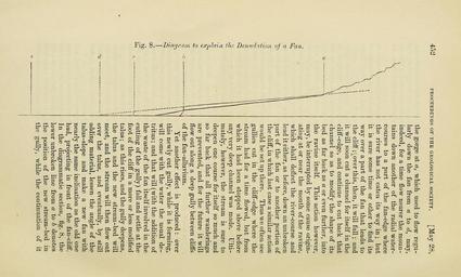 | Keywords: The Quarterly journal of the Geological Society of London (13369164983).jpg 452 <br> PROCEEDINGS OF THE GEOLOGICAL SOCIETY May 28 <br> the gorge at a which used to flow regu- <br> larly clown the fan from a to d may <br> indeed for a time flow nearer the moun- <br> tains down another of the radial water- <br> courses to a part of the fan- edge where <br> the river has not eaten its way in; but <br> it is sure some time or other to find its <br> way over a part of the fan that leads to <br> the cliff ; Yover this then it will fall ; and <br> it will soon cut a channel for itself in the <br> cliff-edge and continue to cut back that <br> channel so as to modify the shape of its <br> bed as far back as a or even further into <br> the ravine itself This action however <br> may be interrupted by some cause origin- <br> ating at or near the mouth of the ravine <br> which shall deflect the river-course and <br> lead it either as before down an unbroken <br> part of the fan or to another portion of <br> the cliff in which last case a similar action <br> would be set up there Thus we often see <br> gullies cut in the cliff-edge where the <br> stream had for a time flowed but from <br> which it had been stopped above before <br> any very deep channel was made Ulti- <br> mately however the stream is sure to <br> deepen one course for itself so much and <br> so far back that all further wanderings <br> are prevented and for the future it will <br> flow out along a deep gully between cliffs <br> of the fan-alluvium <br> Yet another effect is produced over <br> this newly cut gully while it is forming <br> will come with the water the usual de- <br> tritus ; and that will with the addition of <br> the waste of the fan itself involved in the <br> cutting of the gully fall and settle at the <br> foot of the cliff in a more or less modified <br> talus ; as this rises and the gully deepens <br> the talus and the new stream-bed will <br> meet and the stream will then flow out <br> over the talus and eventually by still <br> adding material lessen the angle of the <br> talus-slope and make a new fan with <br> nearly the same inclination as the old one <br> had projecting in front of the fan-cliff <br> In the diagrammatic section fig 8 the <br> lower unbroken line from a to b denotes <br> the position of the new stream-bed in <br> the gully while the continuation of it 39051390 120601 51125 Page 452 Text v 29 http //www biodiversitylibrary org/page/39051390 1873 Geological Society of London Biodiversity Heritage Library The Quarterly journal of the Geological Society of London v 29 1873 Geology Periodicals Smithsonian Libraries bhl page 39051390 dc identifier http //biodiversitylibrary org/page/39051390 smithsonian libraries Information field Flickr posted date ISOdate 2014-03-24 Check categories 2015 August 26 CC-BY-2 0 BioDivLibrary https //flickr com/photos/61021753 N02/13369164983 2015-08-26 10 56 00 cc-by-2 0 PD-old-70-1923 The Quarterly journal of the Geological Society of London 1873 Photos uploaded from Flickr by Fæ using a script |