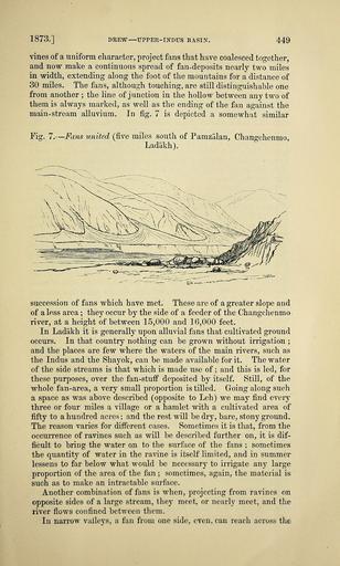 | Keywords: The Quarterly journal of the Geological Society of London (13369159353).jpg 1873 <br> DREW UPPER-INDUS BASIN <br> 449 <br> vines of a uniform character project fans that have coalesced together <br> and now make a continuous spread of fan-deposits nearly two miles <br> in width extending along the foot of the mountains for a distance of <br> 30 miles The fans although touching are still distinguishable one <br> from another ; the line of junction in the hollow between any two of <br> them is always marked as well as the ending of the fan against the <br> main- stream alluvium In fig 7 is depicted a somewhat similar <br> Fig 7 Fans united five miles south of Pamzalan Changchenmo <br> Ladakh <br> succession of fans which have met These are of a greater slope and <br> of a less area ; they occur by the side of a feeder of the Changchenmo <br> river at a height of between 15 000 and 16 000 feet <br> In Ladakh it is generally upon alluvial fans that cultivated ground <br> occurs In that country nothing can be grown without irrigation ; <br> and the places are few where the waters of the main rivers such as <br> the Indus and the Shayok can be made available for it The water <br> of the side streams is that which is made use of ; and this is led for <br> these purposes over the fan-stuff deposited by itself Still of the <br> whole fan-area a very small proportion is tilled Going along such <br> a space as was above described opposite to Leh we may find every <br> three or four miles a village or a hamlet with a cultivated area of <br> fifty to a hundred acres ; and the rest will be dry bare stony ground <br> The reason varies for different cases Sometimes it is that from the <br> occurrence of ravines such as will be described further on it is dif- <br> ficult to bring the water on to the surface of the fans ; sometimes <br> the quantity of water in the ravine is itself limited and in summer <br> lessens to far below what would be necessary to irrigate any large <br> proportion of the area of the fan ; sometimes again the material is <br> such as to make an intractable surface <br> Another combination of fans is when projecting from ravines on <br> opposite sides of a large stream they meet or nearly meet and the <br> river flows confined between them <br> In narrow valleys a fan from one side even can reach across the 39051387 120601 51125 Page 449 Text v 29 http //www biodiversitylibrary org/page/39051387 1873 Geological Society of London Biodiversity Heritage Library The Quarterly journal of the Geological Society of London v 29 1873 Geology Periodicals Smithsonian Libraries bhl page 39051387 dc identifier http //biodiversitylibrary org/page/39051387 smithsonian libraries Information field Flickr posted date ISOdate 2014-03-24 Check categories 2015 August 26 CC-BY-2 0 BioDivLibrary https //flickr com/photos/61021753 N02/13369159353 2015-08-26 10 55 52 cc-by-2 0 PD-old-70-1923 The Quarterly journal of the Geological Society of London 1873 Photos uploaded from Flickr by FĂŚ using a script |