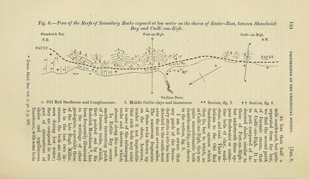 | Keywords: The Quarterly journal of the Geological Society of London (13368817205).jpg 124 <br> PROCEEDINGS OF THE GEOLOGICAL SOCIETY <br> Jan 8 <br> Trans Greol <br> At less than half a <br> mile southward but quite <br> separated from the last <br> we find the second patch <br> of Jurassic strata that <br> of Cadh'-an-Eigh It is <br> in part composed of in- <br> durated shales similar to <br> those of Port-an-Eigh ; <br> but underneath these ap- <br> pear freshwater or estua- <br> rine beds of clay sand- <br> stone and coal Their re- <br> lations to the Old Red <br> Sandstone against which <br> they he but to which as <br> at Cadh'-an-Eigh they are <br> quite unconformable both <br> in strike and dip are shown <br> in the section fig 8 <br> I am not aware that <br> any patch of the Secon- <br> dary strata in situ has been <br> detected to the south-west <br> over the next seven miles <br> The numerous fragments <br> of these rocks thrown up <br> on the shore however <br> render it not improbable <br> that such beds may exist <br> in some of the submerged <br> rocks and skerries which <br> abound along this coast <br> In Eathie Bay occurs <br> another interesting patch <br> of Jurassic rocks which <br> first pointed out by Sir <br> Roderick Murchison has <br> been frequently illustrated <br> in the writings of other <br> geologists especially those <br> of the late Hugh Miller <br> As in the last two in- <br> stances the beds are only <br> seen during low water ; <br> they are composed in one <br> part of alternations of <br> shales and argillaceous <br> limestones with some beds <br> Soc vol ii pt 2 p 307 39051028 120601 51125 Page 124 Text v 29 http //www biodiversitylibrary org/page/39051028 1873 Geological Society of London Biodiversity Heritage Library The Quarterly journal of the Geological Society of London v 29 1873 Geology Periodicals Smithsonian Libraries bhl page 39051028 dc identifier http //biodiversitylibrary org/page/39051028 smithsonian libraries Information field Flickr posted date ISOdate 2014-03-24 Check categories 2015 August 26 CC-BY-2 0 BioDivLibrary https //flickr com/photos/61021753 N02/13368817205 2015-08-26 10 55 20 cc-by-2 0 PD-old-70-1923 The Quarterly journal of the Geological Society of London 1873 Photos uploaded from Flickr by Fæ using a script |