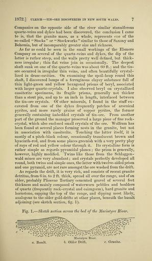 | Keywords: The Quarterly journal of the Geological Society of London (13368815083).jpg 1872 TTLRTCH TIN-ORE DISCOVERIES IN NEAV SOUTH WALES 7 <br> Companies on the opposite side of the river similar stanniferous <br> quartz-veins and dykes had been discovered the conclusion I came <br> to is that the granite mass as a whole represents one of the <br> so-called Stocks or Stockworks similar to those of Saxony and <br> Bohemia but of incomparably greater size and richness <br> As far as could be seen in the small workings of the Elsmore <br> Company on several of the quartz-veins and dykes the dip of the <br> latter is rather steep and the walls pretty well defined but thick- <br> ness irregular ; thin flat veins join in occasionally The deepest <br> shaft sunk on one of the quartz-veins was about 60 ft ; and the tin- <br> ore occurred in irregular thin veins and often beautifully crystal- <br> lized in druse-cavities On examining the spoil-heap round this <br> shaft I discovered lumps of a ferruginous clayey substance full of <br> thin light-green and yellow hexagonal prisms of beryl associated <br> with larger quartz-crystals I also observed beryl on crystallized <br> cassiterite specimens its fragile prisms generally not thicker <br> than a stout pin and up to an inch in length interlaced between <br> the tin-ore crystals Of other minerals I found in the stuff ex- <br> cavated from one of the dykes frequently patches of arsenical <br> pyrites and more rarely grains of copper pyrites the former <br> generally containing imbedded crystals of tin-ore From another <br> part of the ground the manager preserved a large piece of fine rock- <br> crystal which also enclosed small crystals of the ore Wolfram has <br> been found at several places forming nests in the granite but not <br> in association with cassiterite Touching the latter itself it is <br> mostly of a pitch-black colour occasionally translucent brown and <br> hyacinth-red and from some places greenish with a very pretty play <br> of rays of red and yellow colour through it Its crystalline form is <br> rather simple as regards pyramidal planes ; the prism is generally <br> however highly modified Twins like those from the Schlaggen- <br> wald mines are very abundant ; and crystals perfectly developed all <br> round both twins and simple ones the latter with twelve-sided prism <br> and one pyramid are not rare amongst the ore washed from the drift <br> As regards the drift it is very rich and consists of recent granite <br> detritus from 6 in to 2 ft thick spread all over the range and of an <br> older probably Pliocene Tertiary cemented gravel of several feet <br> thickness and mainly composed of waterworn pebbles and boulders <br> of quartz frequently rock-crystal and cairngorm hard granite and <br> hornstone capping the top of the range and dipping most likely <br> analogous to the older gold-drifts at other places beneath the basalt <br> adjoining see sketch section fig 1 <br> Fig 1 ” Sketch section across the becl of the Maeintyre River <br> Macinfcyve River <br> a Basalt 6 Older Drift c Granite 39050909 120601 51125 Page 7 Text v 29 http //www biodiversitylibrary org/page/39050909 1873 Geological Society of London Biodiversity Heritage Library The Quarterly journal of the Geological Society of London v 29 1873 Geology Periodicals Smithsonian Libraries bhl page 39050909 dc identifier http //biodiversitylibrary org/page/39050909 smithsonian libraries Information field Flickr posted date ISOdate 2014-03-24 Check categories 2015 August 26 CC-BY-2 0 BioDivLibrary https //flickr com/photos/61021753 N02/13368815083 2015-08-26 10 53 12 cc-by-2 0 PD-old-70-1923 The Quarterly journal of the Geological Society of London 1873 Photos uploaded from Flickr by Fæ using a script |
