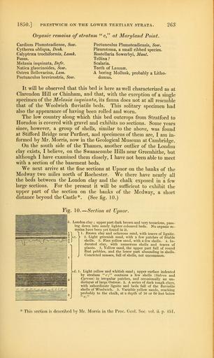 | Keywords: The Quarterly journal of the Geological Society of London (13365640194).jpg 1850 <br> PRESTWICH ON THE LOWER TERTIARY STRATA <br> 263 <br> Organic remains of stratum c at Maryland Point <br> Cardium Plumsteadiense Sow <br> Cytherea obliqua Desk <br> Calyptrsea trochiformis LamJc <br> Fusus <br> Melania inqninata Defr <br> Natica glaucinoides Sow <br> Ostrea Bellovacina Lam <br> Pectunculus brevirostris Sow <br> Pectunciilus Plumsteadiensis Sow <br> Pleurotoma a small ribbed species <br> Rostellaria Sowerbvi Mant <br> Tellina <br> Scalaria <br> Teeth of Lainnse <br> A boring MoUusk probably a Litho- <br> domus <br> It will be observed that this bed is here as well characterized as at <br> Clarendon Hill or Chinham and that with the exception of a single <br> specimen of the Melania inquinata its fauna does not at all resemble <br> that of the Woolwich fluviatile beds This solitary specimen had <br> also the appearance of having been rolled and worn <br> The low country along which this bed outcrops from Stratford to <br> Horndon is covered with gravel and exhibits no sections Some years <br> since however a group of shells similar to the above was found <br> at Stifford Bridge near Purfleet and specimens of them are I am in- <br> formed by Mr Morris now in the Geological Museum at Cambridge <br> On the south side of the Thames another outlier of the London <br> clay exists I believe on the Swanscombe Hills near Greenhithe but <br> although I have examined them closely I have not been able to meet <br> with a section of the basement beds <br> We next arrive at the fine sections at Upnor on the banks of the <br> Medway two miles north of Rochester We there have nearly all <br> the beds between the London clay and the chalk exposed in a few <br> large sections For the present it will be sufficient to exhibit the <br> upper part of the section on the banks of the Medway a short <br> distance beyond the Castle See fig 10 <br> 10 ” Section at Upnor <br> London clay ; upper part dark brown and very tenacious pass- <br> ing down into sandy lighter coloured beds No organic re- <br> mains have been yet found in it <br> Brown clay and ochreous sand with traces of lignite <br> 2 Light greenish sand with a few patches of friable <br> shells 3 Fine yellow sand with a few shells 4 In- <br> durated clay with numerous shells and traces of <br> plants 5 Yellow sand the upper part full of round <br> flint pebbles and the lower part abounding in shells <br> Concreted masses full of shells not uncommon <br> 1 Light yellow and whitish sand ; upper surface indented <br> by stratum c; contains a few shells Ostrea and <br> Cyrena in irregular patches and occasionally an un- <br> derlayer of large Ostrete 2 A series of dark tough clays <br> with subordinate lignite and beds full of the fluviatile <br> shells of Woolwich 3 Variable yellow sands reaching <br> probably to the chalk at a depth of 50 or 6o feet below <br> c <br> This section is described by Mr Morris in the Proc Geol Soc vol ii p 451 36934118 113689 51125 Page 263 Text v 6 http //www biodiversitylibrary org/page/36934118 1850 Geological Society of London NameFound Bellovacina NameFound Calyptrsea trochiformis NameConfirmed Calyptraea trochiformis EOLID 4850559 NameBankID 6418131 NameFound Cardium NameConfirmed Cardium EOLID 50301 NameBankID 2693257 NameFound Cyrena NameConfirmed Cyrena EOLID 4757476 NameBankID 4134596 NameFound Cytherea obliqua NameFound Fusus NameConfirmed Fusus EOLID 2988518 NameBankID 4173880 NameFound Melania inqninata NameConfirmed Melania Melanoides inquinata NameFound Melania inquinata NameConfirmed Melania Melanoides inquinata NameFound Natica glaucinoides NameFound Ostrea NameConfirmed Ostrea EOLID 10719983 NameBankID 2692450 NameFound Pectunciilus NameFound Pectunculus brevirostris NameConfirmed Pectunculus brevirostris NameBankID 6464541 NameFound Pleurotoma NameConfirmed Pleurotoma EOLID 3035199 NameBankID 4302856 NameFound Plumsteadiensis NameFound Rostellaria NameConfirmed Rostellaria EOLID 4873050 NameBankID 3940657 NameFound Scalaria NameConfirmed Scalaria EOLID 4856646 NameBankID 245500 NameFound Tellina NameConfirmed Tellina EOLID 50297 NameBankID 2693370 Biodiversity Heritage Library The Quarterly journal of the Geological Society of London v 6 1850 Geology Periodicals Smithsonian Libraries bhl page 36934118 dc identifier http //biodiversitylibrary org/page/36934118 smithsonian libraries Information field Flickr posted date ISOdate 2014-03-23 Check categories 2015 August 26 CC-BY-2 0 BioDivLibrary https //flickr com/photos/61021753 N02/13365640194 2015-08-26 11 59 01 cc-by-2 0 PD-old-70-1923 The Quarterly journal of the Geological Society of London 1850 Photos uploaded from Flickr by Fæ using a script |