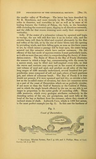 | Keywords: The Quarterly journal of the Geological Society of London (13365171305).jpg 210 <br> PROCEEDINGS OF THE GEOLOGICAL SOCIETY DeC 19 <br> the smaller valley of Woolhope The latter has been described by <br> Sir R Murchison and more recently by Mr Phillips It is 4 <br> miles in diameter and resembles in size as well as in some of its <br> leading features the Caldera of Palma the beds in the boundary <br> cliifs encircling the excavated space dipping in all directions outwards <br> and the cliffs for that reason retaining more easily their steepness or <br> verticality <br> 3rdly If the crater of a submarine volcano be upraised and begin <br> to emerge the sea will still flow into it on its lowest side and the <br> circular basin will then be filled and emptied alternately by the flux <br> and reflux of the tide or by the rise of water blown into the opening <br> by prevailing winds and then falling again as soon as this force ceases <br> to act by which means a passage will be kept open the crater being <br> scoured out like estuaries which have narrow entrances On the <br> efiicacy of this last mode of aqueous erosion I must particularly insist <br> as it aids us more than any other in comprehending the theory of denu- <br> dation-craters The Basin of Mines in the Bay of Fundy illustrates <br> the manner in which a large bay communicating with the ocean by <br> a narrow strait may be filled and half-emptied every tide so that <br> the waves and currents may sweep out in the course of centuries a <br> vast volume of mud and sand and produce on all sides of the bay <br> long ranges of cliffs annually undermined several hundred feet per- <br> pendicular some composed of soft red marl others of hard quartzose <br> grit and others of columnar basalt The Bay of Fundy it is true <br> would not present if it were upraised and laid dry so circular a hol- <br> low as the so-called crater of elevation but there are numerous coves <br> on a part of the coast of Dorsetshire which are as perfectly circular <br> if not more so than the Gulf of Santorin or the Caldera of Palma <br> and in which the single breach effected by the sea on one side is not <br> larger in proportion to the entire girdle of encircling cliffs These <br> cliffs moreover which every geologist attributes exclusively to the <br> denuding action of the sea are precipitous and most lofty at the <br> head of the bay or farthest from the entrance where they consist of <br> inclined strata of chalk Lulworth Cove which is 1300 feet across <br> is the most perfect example see fig 3 In this case the hardness of <br> Fig 3 <br> Coast of Dorsetshire <br> Lulworth Cove <br> Murchison Silurian System Part I p 428 and J Phillips Mem of Geol <br> Survey vol ii p 167 36934061 113689 51125 Page 210 Text v 6 http //www biodiversitylibrary org/page/36934061 1850 Geological Society of London Biodiversity Heritage Library The Quarterly journal of the Geological Society of London v 6 1850 Geology Periodicals Smithsonian Libraries bhl page 36934061 dc identifier http //biodiversitylibrary org/page/36934061 smithsonian libraries Information field Flickr posted date ISOdate 2014-03-23 Check categories 2015 August 26 CC-BY-2 0 BioDivLibrary https //flickr com/photos/61021753 N02/13365171305 2015-08-26 11 50 57 cc-by-2 0 PD-old-70-1923 The Quarterly journal of the Geological Society of London 1850 Photos uploaded from Flickr by Fæ using a script |