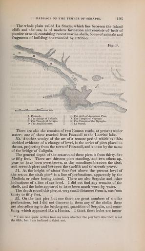 | Keywords: The Quarterly journal of the Geological Society of London (13205775095).jpg BABBAGE ON THE TEMPLE OF SEKAPIS <br> 195 <br> The whole plain called La Starza which lies between the inland <br> cliffs and the sea is of modern formation and consists of beds of <br> pumice or sand containing recent marine shells bones of animals and <br> fragments of building not rounded by attrition <br> Fie 3 <br> '- m sli <br> A Pozzuoli <br> B The Bridge of Caligula <br> C The Temple of Serapis <br> D The Amphitheatre <br> E The Arch of Antoninus Pius <br> F The Temple of Neptune <br> G The Temple of the Nymphs <br> H La Starza <br> There are also the remains of two Roman roads at present under <br> water ; one of these reached from Pozzuoli to the Lucrine lake <br> 50 Another vestige of the art of a remote period which exhibits <br> decided evidence of a change of level is the series of piers placed in <br> the sea projecting from the town of Pozzuoli and known by the name <br> of the bridge of Caligula <br> The general depth of the sea around these piers is from thirty-five <br> to fifty feet There are thirteen piers standing and two others ap- <br> pear to have been overthrown as the soundings between the sixth <br> and seventh piers and between the twelfth and thirteenth prove <br> 51 At the height of about four feet above the present level of <br> the sea on the sixth pier is a line of perforations apparently by the <br> Modiola or other boring animal There are also Serpulse and other <br> indications of a line of sea-level I did not find any remains of the <br> shells and the holes appeared to have been much worn by water <br> The depth round this pier at very small distances from it was from <br> thirty to fifty feet <br> 52 On the last pier but one there are great numbers of similar <br> perforations but I did not discover in them any of the shells there <br> are also adhering to the bricks great quantities of Serpulae and some- <br> thing which appeared like a Flustra I think these holes are incon- <br> I am not quite certain from my notes whether the pier here described is not <br> the fifth but I am inclined to think not 36932924 113687 51125 Page 195 Text v 3 http //www biodiversitylibrary org/page/36932924 1847 Geological Society of London NameFound Antoninus NameFound Caligula NameConfirmed Caligula EOLID 48548 NameBankID 5140470 NameFound Flustra NameConfirmed Flustra EOLID 73457 NameBankID 2576109 NameFound Modiola NameConfirmed Modiola EOLID 71417 NameBankID 2647821 NameFound Serapis NameConfirmed Serapis NameBankID 4341827 Biodiversity Heritage Library The Quarterly journal of the Geological Society of London v 3 1847 Geology Periodicals Smithsonian Libraries bhl page 36932924 dc identifier http //biodiversitylibrary org/page/36932924 smithsonian libraries Information field Flickr posted date ISOdate 2014-03-17 Check categories 2015 August 26 CC-BY-2 0 BioDivLibrary https //flickr com/photos/61021753 N02/13205775095 2015-08-26 12 54 41 cc-by-2 0 PD-old-70-1923 The Quarterly journal of the Geological Society of London 1847 Photos uploaded from Flickr by Fæ using a script |