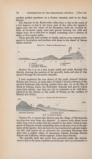 | Keywords: The Quarterly journal of the Geological Society of London (13205936624).jpg and position with those in the island of Samos <br> before noticed <br> Section 4 District of Kastrovalla <br> 3 2 <br> 3 Gravel <br> 2 Lacustrine beds <br> 1 Secondary limestone <br> s Serpentine <br> t Trap <br> Section No 4 is on a line nearly north and south through this <br> district showing the position of the gravelly beds and also of trap <br> ejected through the lacustrine deposits <br> I next examined the two shores of the south channel between <br> Euboea and Greece on both sides of which I found evidences of the <br> ancient freshwater lake having existed there also viz at the Bay of <br> Stura in Euboea where the freshwater deposits and gravel repose <br> upon mica schists ; but they are not so extensive or so well-deve- <br> loped as in the district to the south of Oropo on the confines of <br> Bceotia and Attica <br> Sections Section near Markopoulo <br> Secondary limestone Lacustrine gravel <br> At B is a band of lignite <br> Section No 5 crosses this district near the village of Markopoulo <br> in a line due west from the channel A narrow strip about seven <br> miles long and two miles wide lies parallel to the shore which is com- <br> posed of deposits closely resembling those at Koumi even to the pre- <br> sence of the lignite ; they are however here inclined at a greater angle <br> viz 20° and repose on or surround the secondary limestone that <br> rises into a higher chain of mountains behind forming Mounts <br> Parnes and Citheron which separate Attica from Bceotia <br> The gravelly beds also occur here precisely under the circum- <br> stances and in the same condition as at Koumi and unconformable to 36932791 113687 51125 Page 70 Text v 3 http //www biodiversitylibrary org/page/36932791 1847 Geological Society of London NameFound Euboea NameConfirmed Euboea NameBankID 2995487 NameFound Parnes NameConfirmed Parnes EOLID 32703 NameBankID 3002674 Biodiversity Heritage Library The Quarterly journal of the Geological Society of London v 3 1847 Geology Periodicals Smithsonian Libraries bhl page 36932791 dc identifier http //biodiversitylibrary org/page/36932791 smithsonian libraries Information field Flickr posted date ISOdate 2014-03-17 Check categories 2015 August 26 CC-BY-2 0 BioDivLibrary https //flickr com/photos/61021753 N02/13205936624 2015-08-26 12 51 50 cc-by-2 0 PD-old-70-1923 The Quarterly journal of the Geological Society of London 1847 Photos uploaded from Flickr by Fæ using a script |
