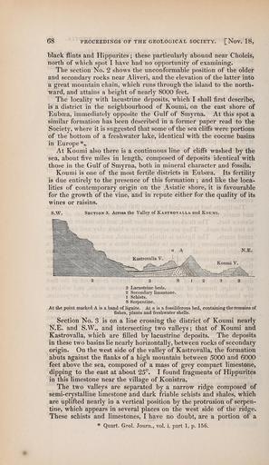 | Keywords: The Quarterly journal of the Geological Society of London (13205931364).jpg 68 <br> PROCEEDINGS OF THE GEOLOGICAL SOCIETY NoV 18 <br> black flints and Hippurites ; these particularly abound near Choleis <br> north of which spot I have had no opportunity of examining <br> The section No 2 shows the unconformable position of the older <br> and secondary rocks near Aliveri and the elevation of the latter into <br> a great mountain chain which runs through the island to the north- <br> ward and attains a height of nearly 8000 feet <br> The locality with lacustrine deposits which I shall first describe <br> is a district in the neighbourhood of Koumi on the east shore of <br> Euboea immediately opposite the Gulf of Smyrna At this spot a <br> similar formation has been described in a former paper read to the <br> Society where it is suggested that some of the sea cliffs were portions <br> of the bottom of a freshwater lake identical with the eocene basins <br> in Europe <br> At Koumi also there is a continuous line of cliffs washed by the <br> sea about five miles in length composed of deposits identical with <br> those in the Gulf of Smyrna both in mineral character and fossils <br> Koumi is one of the most fertile districts in Eubcea Its fertilitj' <br> is due entirely to the presence of this formation ; and like the loca- <br> lities of contemporary origin on the Asiatic shore it is favourable <br> for the growth of the vine and in repute either for the quality of its <br> wmes or raisms <br> s w <br> Section 3 Across the Valley of Kastkovalla and Koumi <br> N E <br> 3 Lacustrine beds <br> 2 Secondary limestone <br> 1 Schists <br> S Serpentine <br> At ttie point marked A is a band of lignite At a is a fossiliferous bed containing the remains of <br> fishes plants and freshwater shells <br> Section No 3 is on a line crossing the district of Koumi nearly <br> N E and S W and intersecting two valleys ; that of Koumi and <br> Kastrovalla which are filled by lacustrine deposits The deposits <br> in these two basins lie nearly horizontally between rocks of secondary <br> origin On the west side of the valley of Kastrovalla the formation <br> abuts against the flanks of a high mountain between 5000 and 6000 <br> feet above the sea composed of a mass of grey compact limestone <br> dipping to the east at about 25° I found fragments of Hippurites <br> in this limestone near the village of Konistra <br> The two valleys are separated by a narrow ridge composed of <br> semi- crystalline limestone and dark friable schists and shales which <br> are uplifted nearly in a vertical position by the protrusion of serpen- <br> tine which appears in several places on the west side of the ridge <br> These schists and limestones I have no doubt are a portion of a <br> Quart Geol Journ vol i part 1 p 156 36932789 113687 51125 Page 68 Text v 3 http //www biodiversitylibrary org/page/36932789 1847 Geological Society of London NameFound Euboea NameConfirmed Euboea NameBankID 2995487 NameFound Hippurites NameConfirmed Hippurites EOLID 4773611 NameBankID 4195877 NameFound Konistra NameConfirmed Konistra NameBankID 4556740 Biodiversity Heritage Library The Quarterly journal of the Geological Society of London v 3 1847 Geology Periodicals Smithsonian Libraries bhl page 36932789 dc identifier http //biodiversitylibrary org/page/36932789 smithsonian libraries Information field Flickr posted date ISOdate 2014-03-17 Check categories 2015 August 26 CC-BY-2 0 BioDivLibrary https //flickr com/photos/61021753 N02/13205931364 2015-08-26 12 51 32 cc-by-2 0 PD-old-70-1923 The Quarterly journal of the Geological Society of London 1847 Photos uploaded from Flickr by Fæ using a script |