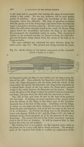 | Keywords: The Quarterly journal of the Geological Society of London (13204794655).jpg 404 C CALLAWAY ON THE NEWER GNEISSIC <br> to the same bed of quartzite but overlaps the edges of several beds <br> within a few yards We are not however left to such minute <br> points of criticism Here again our knowledge of the Assynt <br> succession solves the difficulty The beds of quartzite in contact <br> with the gneiss are of the Seamy type ; and lower down the slope the <br> upper Annelidiau division comes in Further west at the corner <br> where the cliff curves abruptly round to the south the Erown Flags <br> appear below the Annelidian ; and below the flags at the base of <br> the escarpment the Annelidian comes in again This structure is <br> similar to the inverted syncline on Camas-an-Duin the Salter etta- <br> grit and Dolomite being absent from the centre of the fold as in <br> Cr aig-n a-f aolin <br> The same relations are continued for some distance along the <br> strike- section fig 10 The ground now rising towards the south <br> Fig 10 ” Strike- Section of the western escarpment of Ben Arnaboll <br> Scale 8 inches to 1 mile <br> N S <br> the Quartzite under the flags is soon hidden and the flags occupy the <br> base of the cliff Then suddenly the Quartzite about 200 ft thick <br> above the Flags disappears and the latter form the whole of the <br> scarp below the gneiss the Quartzite and Flags being separated by <br> a vertical fault except at the top where the Flags send a narrow <br> wedge to the north between the Quartzite and the gneiss Further <br> south the place of the Flags is taken by confused masses of quartzite <br> and flags ; but just above the little loch the succession is clear <br> The cliff at this spot from its foot to the base of the gneiss is <br> 200 feet high It displays an exact repetition of the Assynt series <br> from the bottom of the Flags to the lower part of the Dolomite <br> Quartzite lies at the foot of the scarp Ascending over the Flags <br> in which we can make out three horizons at 60 feet we reach the <br> S alter ella-grit and Quartzite and at 90 feet we come to the base of <br> 10 ft of dolomite At 100 feet the Flags rest on the Dolomite the <br> lower rock dipping E S E at 40° and the Flags at 30° the beds of <br> dolomite being curved outwards as if by the pressure of the over- <br> lying flags The second 100 feet is the lower succession repeated <br> even to the 10 feet of dolomite It will be observed that in this <br> section the rocks are not inverted <br> The faulting here is not normal ; for the repeated series rests on <br> the lower one in a steep cliff but is clearly reversed The westerly <br> push of the repeated beds tends to confirm my explanation of the 36929011 113681 51125 Page 404 Text 39 http //www biodiversitylibrary org/page/36929011 1883 Geological Society of London Biodiversity Heritage Library The Quarterly journal of the Geological Society of London v 39 1883 Geology Periodicals Smithsonian Libraries bhl page 36929011 dc identifier http //biodiversitylibrary org/page/36929011 smithsonian libraries Information field Flickr posted date ISOdate 2014-03-16 Check categories 2015 August 26 CC-BY-2 0 BioDivLibrary https //flickr com/photos/61021753 N02/13204794655 2015-08-26 12 51 16 cc-by-2 0 PD-old-70-1923 The Quarterly journal of the Geological Society of London 1883 Photos uploaded from Flickr by Fæ using a script |