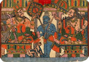 | Keywords: The sage Vyasa and the king Janamejaya..jpg en Story-telling painting in gouache of the 'Paithan' type illustrating a narrative from the Mahabharata The sage Vyasa and the king Janamejaya With a background of a pillared hall the sage Vyasa seen here on the right narrates the story of Harishchandra to king Janamejaya Both characters are seated facing each other on decorated thrones with one knee resting on the seat and the other flexed bound by a yogapatta This detail signifies that they are steeped in a serious conversation The king carries the appurtenances of his status a crown on his head bow leaning on his shoulder arrow in his right hand and a filled quiver resting at his side The sage is elegantly dressed and bejewelled with matted hair knotted beard and a yajnopavita prominently shown across his chest incidentally the wrong way round it hangs from the right shoulder instead of hanging from the left Between Janamejaya and Vyasa stands a third person with matter hair and dressed in a loincloth possibly a disciple of the sage carrying a fan and an umbrella appurtenances of both gods and kings A monkey is shown frolicking at his feet 19thC late -20thC early http //www britishmuseum org/research/search_the_collection_database/search_object_details aspx objectid 3064002 partid 1 searchText mahabharata fromADBC ad toADBC ad numpages 10 images on orig 2fresearch 2fsearch_the_collection_database aspx currentPage 7 Paithan Style PD-Art Uploaded with UploadWizard Janamejaya Vyasa Loincloths in art |