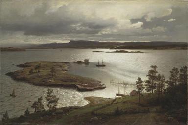 | Keywords: The Sandvik Fiord (Hans Fredrik Gude) - Nationalmuseum - 18346.tif Artwork Creator Hans Gude The Sandvik Fiord Hans Frederik Gude is mainly associated with majestic Norwegian views of fjords and mountains Often on large canvases He painted this work relatively late in his career Although the painting is fairly small the experience of the grandeur of the scene is no less intense What is most striking is the light as impressive in itself as in the way Gude painted it and combined it with the shifting motion of the surface of the water Hans Frederik Gude förknippas frÀmst med mÀktiga norska vyer frÄn fjordar och fjÀll Ofta pÄ stora dukar Den hÀr mÄlningen utförde han förhÄllandevis sent i sitt yrkesliv Storleken Àr ganska liten men upplevelsen av vyns vidstrÀckthet Àr inte mindre för det Det mest slÄende Àr ljuset lika imponerande i sig sjÀlv som i hur Gude mÄlat det och fÄtt det att förenas med vattenytans skiftande rörelser header Hans Frederik Gude is mainly associated with majestic Norwegian views of fjords and mountains Often on large canvases He painted this work relatively late in his career Although the painting is fairly small the experience of the grandeur of the scene is no less intense What is most striking is the light as impressive in itself as in the way Gude painted it and combined it with the shifting motion of the surface of the water Hans Frederik Gude förknippas frÀmst med mÀktiga norska vyer frÄn fjordar och fjÀll Ofta pÄ stora dukar Den hÀr mÄlningen utförde han förhÄllandevis sent i sitt yrkesliv Storleken Àr ganska liten men upplevelsen av vyns vidstrÀckthet Àr inte mindre för det Det mest slÄende Àr ljuset lika imponerande i sig sjÀlv som i hur Gude mÄlat det och fÄtt det att förenas med vattenytans skiftande rörelser 1879 Oil on canvas Olja pÄ duk Size cm 81 5 54 5 Framed Size cm 100 71 8 Institution Nationalmuseum Stockholm Signerad H F Gude 1879 accession number 18346 NM 1343 place of creation Nationalmuseum Nationalmuseum Stockholm cooperation project Licensed-PD-Art PD-old-auto PD-Nationalmuseum_Stockholm 1903 Media contributed by Nationalmuseum Stockholm 2016-10 Paintings in the Nationalmuseum Stockholm Hans Gude |