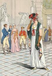 | Keywords: The Sculpture Gallery in the Louvre Museum, 1806.jpg Artwork The Louvre was opened as a museum in 1793 and admission was free to the public on weekends The antique sculpture collection was added in 1800 into the former apartments of Anne of Austria or the petite galerie The woman in the foreground is wearing a châle cachmire or cashmere shawl These shawls imported from India were ironically made more popular after the 1806 continental embargo making cashmere shawls very expensive to obtain Her hat is a bonnet with feathers attached with a silk ribbon and was very popular during the time of Napoleon I 1898 colored plate 10 x 15 cm Institution Brown University Library object history exhibition history credit line Published in Octave Uzanne Fashion in Paris the various phases of feminine taste and aesthetics from 1797 to 1897 London William Heinemann 1898 accession number 1145807704968636 PD-old Les modes de Paris 024 Images of Paris from the Brown University Library 1806 in Paris Fashion in 1806 Musée du Louvre in art Regency revival genre paintings 1898 engravings |