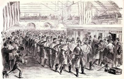 | Keywords: snow (from Frank Leslie's Illustrated History of the Civil War..., edited by Louis Shepheard Moat, Published by Mrs. Frank Leslie, New York, 1895) "Thousands of patriotic citizens filled every available space in the big railroad station in Jersey City when the Sixth Regiment of Massachusetts entered, on its way to defend the Capital, Washington, April 18th, 1861, after marching through the streets of New York. The people enthusiastically cheered the soldiers and wished them a safe journey as they boarded the waiting train. The regiment was composed of eight hundred men. This was the regiment which, upon its arrival in Baltimore, was stoned and shot at by a mob of Southern men who attempted to stop its progress to Washington." (from Frank Leslie's Illustrated History of the Civil War..., edited by Louis Shepheard Moat, Published by Mrs. Frank Leslie, New York, 1895) "Thousands of patriotic citizens filled every available space in the big railroad station in Jersey City when the Sixth Regiment of Massachusetts entered, on its way to defend the Capital, Washington, April 18th, 1861, after marching through the streets of New York. The people enthusiastically cheered the soldiers and wished them a safe journey as they boarded the waiting train. The regiment was composed of eight hundred men. This was the regiment which, upon its arrival in Baltimore, was stoned and shot at by a mob of Southern men who attempted to stop its progress to Washington." |