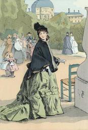 | Keywords: The Square of the Tuileries, 1870.jpg Artwork The woman depicted in this plate is wearing a green dress with a train adorned with ribbons near the bottom She is also wearing a dark mantelet lined with fur She is wearing a small black hat worn on top of the head Abstract sources Boucher François 20 000 Years of Fashion New York Harry N Abrams Inc 1967 Ruppert Jacques Le Costume Français Paris Flammarion 1996 1898 colored plate 10 x 15 cm Institution Brown University Library object history exhibition history credit line Published in Octave Uzanne Fashion in Paris the various phases of feminine taste and aesthetics from 1797 to 1897 London William Heinemann 1898 accession number 1150468746277751 PD-old Mantelets clothing 1870 Les modes de Paris 080 Images of Paris from the Brown University Library 1870 in Paris Jardin des Tuileries in art Females with green dresses in art 1870s dresses Fur fashion in 1870 |
