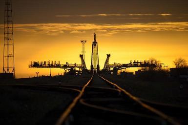 Keywords: sun rises Soyuz launch pad TMA-12M spacecraft rolled out train Baikonur Cosmodrome Kazakhstan