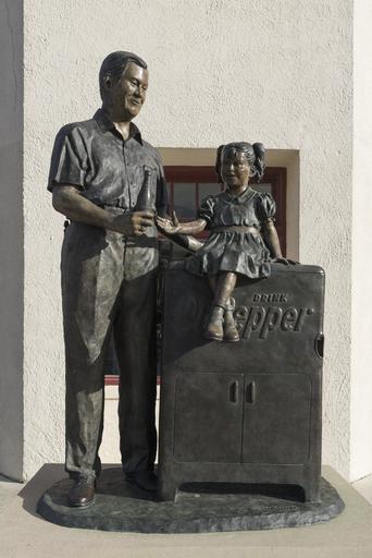 Keywords: The "Sweet Inspiration" statue outside the Dublin Bottling Works and W.P. Kloster Museum in Dublin, Texas LCCN2015630959.tif 1 photograph digital tiff file color Notes This plant produced a distinctive form of Dr Pepper the in Dr wasn't added until the product was canned a soda popular throughout the South The distinction it used only pure cane sugar and does to this day in several sodas that it bottles on site Dr Pepper was first concocted in Waco Texas and iintroduced as a fountain drink at the world's fair of 1904 in St Louis but it was first bottled at this plant in Dublin The statue depicts Kloster known locally as Mr Dr Pepper and an appreciative young customer; Kloster was a longtime plant manager ; Gift; The Lyda Hill Foundation; 2014; DLC/PP-2014 054 ; Title date and keywords based on information provided by the photographer ; Forms part of Lyda Hill Texas Collection of Photographs in Carol M Highsmith's America Project in the Carol M Highsmith Archive ; Credit line The Lyda Hill Texas Collection of Photographs in Carol M Highsmith's America Project Library of Congress Prints and Photographs Division photo date 2014-09-04 Creator Carol M Highsmith LOC-image highsm 30723 Library of Congress Catalog http //lccn loc gov/2015630959 Image download https //cdn loc gov/master/pnp/highsm/30700/30723a tif Original url http //hdl loc gov/loc pnp/highsm 30723 photo license PD-Highsmith 32 5 0561 0 N 98 20 5596 0 W alt 431_source exif_heading 2000 bronze statues 2000s bronze statues in the United States Statues of standing men Statues of sitting children Dr Pepper Dublin Texas Photographs by Carol M Highsmith Lyda Hill Texas Collection of Photographs in Carol M Highsmith's America Project in the Carol M Highsmith Archive The Lyda Hill Texas Collection of Photographs in Carol M Highsmith's America Project Library of Congress Prints and Photographs Division Images uploaded by Fæ