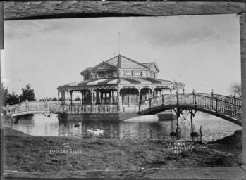 | Keywords: blackandwhite monochrome photo border outdoor architecture water bridge sea black and white View of the tea kiosk at the Feilding Racecourse. The ornate building appears to octagonal, and is set in an area of water, with arched bridges leading to it, and a verandah-covered walkway around the building. Photograph probably taken by Alfred Hubert Maclean, stationer of Feilding. Inscriptions: Inscribed - Photographer's title on negative -bottom left: Maclean seriesbottom right: Tea Kiosk. Racecourse, Feilding. 1323. Quantity: 1 b&w original negative(s). Physical Description: Dry plate glass negative Maclean, Alfred Hubert, d 1952. The tea kiosk at Feilding Racecourse - Photograph probably taken by Arthur Hubert Maclean. Price, William Archer, 1866-1948 :Collection of post card negatives. Ref: 1/2-001424-G. Alexander Turnbull Library, Wellington, New Zealand. natlib.govt.nz/records/23224700 View of the tea kiosk at the Feilding Racecourse. The ornate building appears to octagonal, and is set in an area of water, with arched bridges leading to it, and a verandah-covered walkway around the building. Photograph probably taken by Alfred Hubert Maclean, stationer of Feilding. Inscriptions: Inscribed - Photographer's title on negative -bottom left: Maclean seriesbottom right: Tea Kiosk. Racecourse, Feilding. 1323. Quantity: 1 b&w original negative(s). Physical Description: Dry plate glass negative Maclean, Alfred Hubert, d 1952. The tea kiosk at Feilding Racecourse - Photograph probably taken by Arthur Hubert Maclean. Price, William Archer, 1866-1948 :Collection of post card negatives. Ref: 1/2-001424-G. Alexander Turnbull Library, Wellington, New Zealand. natlib.govt.nz/records/23224700 |