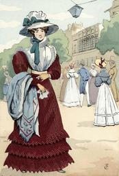 Keywords: The Théatre de Madame, 1827.jpg Artwork The woman depicted in this plate is wearing a red dress with a flounced hem and a fairly low belted waist She has a very high lace collar carries a cashmere shawl and wears a wide-brimmed hat Abstract source Ruppert Jacques Le Costume Français Paris Flammarion 1996 1898 colored plate 10 x 15 cm Institution Brown University Library object history exhibition history credit line Published in Octave Uzanne Fashion in Paris the various phases of feminine taste and aesthetics from 1797 to 1897 London William Heinemann 1898 accession number 1150467297528077 PD-old Les modes de Paris 038 Images of Paris from the Brown University Library Théâtre du Gymnase Marie-Bell 1827 in Paris Fashion in 1827 Females with red dresses in art 1820s dresses