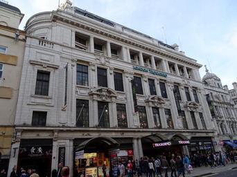 | Keywords: architecture building outdoor building complex The London Trocadero was an entertainment complex on Coventry Street, with a rear entrance in Shaftesbury Avenue, London. It was originally built in 1896 as a restaurant, and closed in 1965. In 1984 the complex reopened as an exhibition and entertainment space, which operated until 2014. As of 2014, it is under redevelopment to become a hotel. Since at least 1919 the Trocadero has been abbreviated to the Troc, and under that name it appears in a poem by John Betjeman.[1] The complex incorporates a number of separate but close by historic London buildings, including the old London Pavilion Theatre, that have in the past hosted the Palace of Varieties, the New Private Subscription Theatre, the Royal Albion Theatre, the Argyll Subscription Rooms, the Eden Theatre and the Trocadero Restaurant. The name Trocadero indirectly derives from the Battle of Trocadero in 1823, through the Palais du Trocadéro in Paris, named after the French victory. The London Trocadero was an entertainment complex on Coventry Street, with a rear entrance in Shaftesbury Avenue, London. It was originally built in 1896 as a restaurant, and closed in 1965. In 1984 the complex reopened as an exhibition and entertainment space, which operated until 2014. As of 2014, it is under redevelopment to become a hotel. Since at least 1919 the Trocadero has been abbreviated to the Troc, and under that name it appears in a poem by John Betjeman.[1] The complex incorporates a number of separate but close by historic London buildings, including the old London Pavilion Theatre, that have in the past hosted the Palace of Varieties, the New Private Subscription Theatre, the Royal Albion Theatre, the Argyll Subscription Rooms, the Eden Theatre and the Trocadero Restaurant. The name Trocadero indirectly derives from the Battle of Trocadero in 1823, through the Palais du Trocadéro in Paris, named after the French victory. |