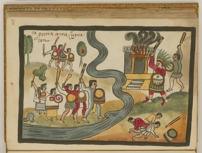 | Keywords: The War against Coyoacan WDL6729.png  Artwork ru Това Хуан де около 1546 г    около 1626 г fr Tovar Jean de 1546-1626 env en Tovar Juan de circa 1546-circa 1626 zh 胡安·德·托瓦尔,约 1546 年 - 约 1626 年 pt Tovar Juan de por volta de 1546-por volta de 1626 ar خوان دو توفار، حوالي 1546-حوالي 1626 es Tovar Juan de circa 1546-circa 1626 ru Война с Койоаканом fr La guerre de Coyoacan en The War against Coyoacan zh 科约阿 战争 pt A guerra contra Coyoacan ar الحرب ضد كُوْيْواكان ru Кодекс Това а авто ом кото ого считается мексиканский иезуит XVI века Хуан де Това соде жит под обную инфо мацию об об ядах и це емониях ацтеков известных также как мешика Кодекс п оиллюст и ован 51 аква ельным  исунком на полную ст аницу Рисунки в кото ых наблюдается значительное влияние пиктог афических  укописей доколониальных в емен обладают исключительными художественными достоинствами Рукопись состоит из т ех  азделов В пе вом  азделе описана исто ия путешествий ацтеков до п ибытия испанцев Вто ой  аздел п едставляющий собой иллюст и ованную исто ию ацтеков составляет основной объем  укописи В т етьем  азделе находится календа ь Това а  а этой иллюст ации из вто ого  аздела изоб ажена битва п и Койоакане Воо уженные дубинками и щитами воины с ажаются пе ед го ящим х амом Воины некото ые из них женщины стоят на бе егах  еки Рядом видны дубинки символ холма вид сбоку и ме твые воины  а полководце головной убо с пе ьями возможно птицы кетцаль Ученый Жак Лафайе  едакто факсимильного издания  укописи Това а п едполагал что возможно военачальником является Тлакаелель <br>Ацтеки; С ажения; Кодекс; Индейцы  ексики; Ко енные на одности;  езоаме ика; Солдаты; Кодекс Това а fr Le codex Tovar attribué à Jean de Tovar jésuite mexicain du XVI<sup>e</sup> siècle contient des informations détaillées sur les rites et les cérémonies des Aztèques également connus sous le nom de Mexicas Il est illustré de 51 aquarelles de la taille d'une page Fortement influencées par les manuscrits pictographiques de la période précontact ces peintures sont d'une qualité artistique exceptionnelle Le manuscrit est divisé en trois sections La première section contient une histoire des voyages des Aztèques avant l'arrivée des Espagnols La seconde section une histoire illustrée du peuple aztèque constitue la majeure partie du manuscrit La troisième section est constituée du calendrier de Tovar Cette illustration extraite de la seconde section représente la bataille de Coyoacan Des soldats se battent avec des massues de guerre et des boucliers devant un temple en train de brûler Ces soldats dont certains sont des femmes se tiennent sur les rives d'un fleuve Des massues de guerre le glyphe d'une colline vu de côté et des soldats morts sont également dessinés Le chef des soldats porte une coiffe à plumes de quetzal L'érudit Jacques Lafaye éditeur de la version fac-similé du manuscrit de Tovar émit l'hypothèse selon laquelle le chef de ces soldats était Tlacaelel <br>Aztèques; Batailles; Codex; Indiens du Mexique; Peuples autochtones; Méso-Amérique; Soldats; Codex Tovar en The Tovar Codex attributed to the 16th-century Mexican Jesuit Juan de Tovar contains detailed information about the rites and ceremonies of the Aztecs also known as Mexica The codex is illustrated with 51 full-page paintings in watercolor Strongly influenced by pre-contact pictographic manuscripts the paintings are of exceptional artistic quality The manuscript is divided into three sections The first section is a history of the travels of the Aztecs prior to the arrival of the Spanish The second section an illustrated history of the Aztecs forms the main body of the manuscript The third section contains the Tovar calendar This illustration from the second section depicts the Battle of Coyoacan Soldiers are shown fighting with war clubs and shields before a burning temple Soldiers some of them women stand on the banks of a river Also shown are war clubs the glyph of a hill shown from the side and dead soldiers The chief soldier wears a feathered or quetzal headdress The scholar Jacques Lafaye the editor of the facsimile edition of the Tovar manuscript hypothesized that the leader of the soldiers might be Tlacaélel <br>Aztecs; Battles; Codex; Indians of Mexico; Indigenous peoples; Mesoamerica; Soldiers; Tovar Codex zh 这 托瓦尔手抄 被认为是 16 世纪墨西哥 稣会士胡安·德·托瓦尔 Juan de Tovar   ,其中包含关于阿兹特克(也称墨西卡)礼仪和仪式的详细信息 手抄 中  51 整页的水彩画 这些画 受到与外界接触前的象形手稿的巨大影响,具 极高的艺 品质 手稿分为三个部分 第 部分介绍西班牙人到 之前,阿兹特克人的迁徙历史 第二部分是手稿的主体部分,以图画介绍了阿兹特克人的历史 第三部分包含托瓦尔日历 这幅插图 自第二部分,描绘了发生 科约阿 的战争 士兵们