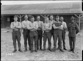| Keywords: blackandwhite monochrome outdoor black and white Group portrait of the New Zealand men's Tug-o-War team that beat every other Base Depot team at the camp in Etaples during World War I. The uniformed soldier, far right, has been identified as belonging to the Nelson Infantry. Photograph taken 3 August 1918 by Henry Armytage Sanders. Inscriptions: Inscribed - Photographer's title on negative -bottom left: H842. Quantity: 1 b&w original negative(s). Physical Description: Dry plate glass negative 4 x 5 inches The winning New Zealand men's tug-o-war team, Etaples, France. Royal New Zealand Returned and Services' Association :New Zealand official negatives, World War 1914-1918. Ref: 1/2-013423-G. Alexander Turnbull Library, Wellington, New Zealand. natlib.govt.nz/records/23190581 Group portrait of the New Zealand men's Tug-o-War team that beat every other Base Depot team at the camp in Etaples during World War I. The uniformed soldier, far right, has been identified as belonging to the Nelson Infantry. Photograph taken 3 August 1918 by Henry Armytage Sanders. Inscriptions: Inscribed - Photographer's title on negative -bottom left: H842. Quantity: 1 b&w original negative(s). Physical Description: Dry plate glass negative 4 x 5 inches The winning New Zealand men's tug-o-war team, Etaples, France. Royal New Zealand Returned and Services' Association :New Zealand official negatives, World War 1914-1918. Ref: 1/2-013423-G. Alexander Turnbull Library, Wellington, New Zealand. natlib.govt.nz/records/23190581 |
