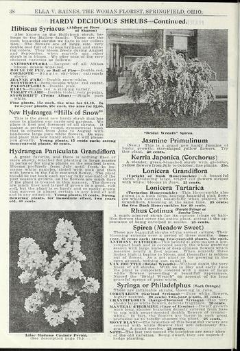 | Keywords: The wonderful new rose hoosier beauty (16201402700).jpg page 39 <br> Bridal Wreath Spirea <br> Jasmine Primulinum <br> New This is a grand new hardy Jasmine of <br> bushy growth; star-shaped yellow flowers Try <br> this plant 20 cents <br> Kerria Japonica Corchorus <br> A slender green-branched shrub with globular <br> yellow flowers from July to October; fine plants 25e <br> Lonicera Grandiflora <br> Upright or Bush Honeysuckle ” A beautiful <br> shrub producing large bright red flowers striped <br> with white; blooms in June 25 cents <br> Lonicera Tartar ica <br> Tartarian Honeysuckle ” This Honeysuckle also <br> grows in a bush form bearing beautiful pink flow- <br> ers which contrast beautifully when planted with <br> Grandiflora blooming at the same time 25 cents; <br> the two Bush Honeysuckles for 40 cents <br> Rhus Cotinus fi±E3S - <br> A much admired shrub for its curious fringe or hair- <br> like flowers that cover the entire plant giving it the ap- <br> pearance of being envolped in smoke 25 cents <br> Spirea Meadow Sweet <br> These are beautiful shrubs of the easiest culture Their <br> blooming extends over a period of three months One- <br> year 15 cents each; strong two-year-old plants 35c each <br> ANTHONY WATERER ” This beautiful gem makes a low <br> compact bush and is covered nearly the whole growing <br> season with large umbels of deep crimson flowers which <br> measure nearly a foot across When scarcely three <br> inches high it begins to bloom and thereafter is seldom <br> out of flower As a pot plant or for growing in the <br> open ground nothing can equal it <br> VAN HOUTTEI Bridal Wreath ” 'Without doubt the very <br> finest of all shrubs With us in May and early June <br> the plant is completely covered with a mass of large <br> – white flowers presenting a beautiful appearance <br> Named the Bridal Wreath on account of its long <br> graceful sprays of pure white <br> Syringa or Philadelphus Mock orange <br> These are invaluable shrubs blooming in June <br> CORONARIUS Garland Syringa ” Pure white flowers <br> highly scented 20 cents; two-year plants 35 cents <br> GRANDIFLORUS Large-Flowered Syringa ” Has very <br> showy large white flowers delicate fragrance 20 cents <br> MANTEAU d'HERMINE Cape of Ermine ” Dwarf growth <br> with long slender branches densely covered from base <br> to top with sweet-scented double flowers of creamy- <br> white In fact the flowers are borne in such great <br> profusion as to totallv obscure the plant 25 cents <br> MONT BLANC ” The branches of this beautiful variety are <br> covered with white flowers that are delieiously fra- <br> grant A grand species 25 cents <br> NOTE ” The last two named Philadelphus are away ahea <br> of the old varieties Being dwarf they are superb f- <br> hedge planting 41856292 131010 64616 Page 38 Text http //www biodiversitylibrary org/page/41856292 1918 10 5962/bhl title 64616 Ella V Baines Firm ; Henry G Gilbert Nursery and Seed Trade Catalog Collection NameFound Cotinus NameConfirmed Cotinus EOLID 71148 NameBankID 2652286 NameFound Hibiscus NameConfirmed Hibiscus L EOLID 60741 NameFound Hydrangea NameConfirmed Hydrangea sect Cornidia Ruiz Pav Engl EOLID 40082 NameFound Japonica Corchorus NameConfirmed Japonica EOLID 32828 NameBankID 3002064 NameFound Kerria NameConfirmed Kerria DC EOLID 22232 NameFound Lilac NameConfirmed Lilac P Miller 1754 NameFound Lonicera NameConfirmed Lonicera EOLID 60796 NameBankID 2657168 NameFound Philadelphus NameConfirmed Philadelphus EOLID 11171705 NameBankID 2649718 NameFound Rhus NameConfirmed Rhus EOLID 37840 NameBankID 2652266 NameFound Rubus NameConfirmed Rubus EOLID 29914 NameBankID 2576519 NameFound Syriacus NameConfirmed Syriacus NameBankID 5087771 NameFound Syringa NameConfirmed Syringa EOLID 38055 NameBankID 2655523 Biodiversity Heritage Library Miss Ella V Baines the woman florist Springfield Ohio The wonderful new rose hoosier beauty Garden Stories Bulbs Plants Catalogs Flowers Plants Ornamental Roses Seed industry and trade Seeds Trade catalogs U S Department of Agriculture National Agricultural Library bhl page 41856292 dc identifier http //biodiversitylibrary org/page/41856292 bhlGardenStories BHLinbloom bulbs plants plants ornamental u s department of agriculture national agricultural library bhlgardenstories bhlinbloom Information field Flickr posted date ISOdate 2015-01-28 CC-BY-2 0 BioDivLibrary https //flickr com/photos/61021753 N02/16201402700 2015-08-24 07 56 15 cc-by-2 0 PD-old-70-1923 The wonderful new rose hoosier beauty Photos uploaded from Flickr by Fæ using a script |