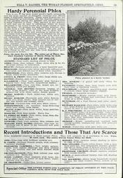 | Keywords: The wonderful new rose hoosier beauty (16362784366).jpg ELLA V BAINES THE WOMAN FLORIST SPRINGFIELD OHIO <br> 19 <br> Hardy Perennial Phlox <br> This is one of the most easily grown hardy perennials <br> and the large number of beautiful varieties now offered <br> make it especially desirable These noble flowers are not <br> only beautiful as individuals but the cheerful appearance <br> of our gardens during the summer and autumn months <br> is much indebted to them They succeed in any position <br> or soil and can be used to advantage either as single <br> specimens in the mixed border or as large clumps or beds <br> on the lawn To produce the best results however they <br> should have a rich deep and rather moist soil and let <br> each clump have a space of from two to three feet in <br> which to develop They will continue to thrive for sev- <br> eral years with little attention as is attested by the fine <br> clumps about old homesteads The ease with which they <br> are cultivated their entire hardiness and the extended <br> time of blooming combined with the varied and beautiful <br> coloring make them especially valuable for garden plant- <br> ing The Perennial Phlox usually commence to bloom in <br> early summer and are brilliant with color until after <br> several frosts have come They are admirably adapted <br> for cemetery planting also for a low hedge or screen to <br> hide old fences and unsightly objects Do not fail to <br> plant Phlox in the fall any time from September until <br> the ground is frozen <br> Price 12c each; five for 50c The entire set of Thirty Dis- <br> tinct Standard Varieties of Hardy Phlox for 2 60 <br> STANDARD LIST OF PHLOX <br> ALCESTE Deep violet shading almost to blue <br> ATHIS Deep clear salmon Some claim this to be the <br> showiest variety in cultivation <br> BEAUTY Delicate silvery-pink; a most beautiful sort <br> BERANGER Ground color white delicately suffused with <br> rosy-pink and distinct eye of same color; exquisite <br> BRIDESMAID Pure white clear carmine eye; blooms in <br> large round heads; attractive <br> CONSUL H FROST Deep rose color; large white eye <br> DAXTON Scarlet pure red eye <br> ECLAIREUR Clear rosy-magenta with large <br> lighter halo; large florets; magnificent bedder <br> ESCLARMONDE Clear rosy-lilac deeper eye ex- <br> quisitely rayed and shaded <br> GENERAL VON HEUTZE Immense trusses of <br> very large flowers; color of the most brilliant <br> salmon-red with white center; simply grand <br> HENRY MARCEL Dark violet-rose white eye; <br> distinct <br> HENRY MURGER Enormous pure white flowers <br> with very large showy deep carmine eye or cen- <br> ter; fine florets and trusses; extra <br> HERVOR Carmine-rose with pure white center <br> INDEPENDENCE An excellent large-flowering <br> early pure white; none better <br> JEANNE d'ARC Pure snow white large panicles; <br> very sweet <br> KOSSUTH Rich deep purple Extra fine <br> LA PERI E DU NORD Pure white large deep dis- <br> tinct red eye; extra fine <br> LE 3IAHDI Dark violet-purple <br> LOTHAIR Clear even carmine deep crimson eye <br> MADAME PAUIi DUTRE Delicate lilac-rose re- <br> minding one of some of the beautiful soft pink <br> Orchids <br> Phlox xilanted in a hardy border <br> MRS JENKINS A grand tall early white for <br> massing <br> PANTHEON Large clear deep bright pink with <br> faint halo; a charming variety <br> PEACHBLOW Delicate peachblow-pink shading <br> to almost white; large trusses; elegant <br> PHARON A beautiful lavender <br> ROSENBERG Bright reddish-violet with blood- <br> red eye; large trusses and individual flower as <br> large as a silver dollar <br> RYNSTR03I Of a Paul Neyron pink color; excel- <br> lent <br> RICltARD WALXACE Pure white with violet-rose <br> eye; large flowers in immense panicles Too much <br> cannot be said of this variety <br> R P STRUTHERS In our estimation the very best <br> Phlox grown today it has no faults Color clear <br> cherry-red suffused with salmon shades; deep red <br> eye; fine large truss The color is so clear and <br> clean that each individual floret stands out as <br> distinct as a cameo <br> SLEBOLD Bright vermilion-red overlaid with <br> orange-scarlet crimson-red eye; will please <br> everybody <br> WIDAR Violet-blue with pure white eye <br> Recent Introductions and Those That Are Scarce <br> Some wonderful creations in these newest Phlox <br> 20 cents each The entire E <br> ASIA Lilac-rose with brilliant carmine eye <br> B COMTE Brilliant French purple with crimson- <br> carmine shadings <br> ELIZABETH CAMPBELL Very bright salmon- <br> pink with lighter shadings and dark crimson <br> eye An entirely new and much wanted shade <br> in Phlox <br> GRUPPENKONIGIN Pure flesh colored rose with <br> carmine eye Extra fine <br> JULES CAMBON Clear magenta with large dis- <br> tinct white star in center of each floret; super- <br> latively rich and fine <br> LE PROPHETE Violet-blue brown center <br> They will certainly be a revelation to you Price <br> leven Scarce Phlox for 2 00 <br> MOZART Deep carmine center shading to white <br> at edge of flower <br> MISS LINGARD Pearly-white flower with a very <br> faint pink eye; very remarkable bloomer produc- <br> ing two to three crops of flowers during the sea- <br> son Indispensable as a cut flower for florists' use <br> PROFESSOR VLRCHOW Bright carmine overlaid <br> with orange-scarlet <br> RUBUS A parti-colored variety rosy-red shading <br> to white <br> VON HOCHBERG Extra large beautifully formed <br> trusses the ideal crimson Phlox; richest of its <br> color 41856312 131010 64616 Page 19 Text http //www biodiversitylibrary org/page/41856312 1918 10 5962/bhl title 64616 Ella V Baines Firm ; Henry G Gilbert Nursery and Seed Trade Catalog Collection NameFound Athis NameConfirmed Athis EOLID 47709 NameBankID 3005903 NameFound Phlox NameConfirmed Phlox L EOLID 40661 NameFound Phlox alceste NameFound Rubus NameConfirmed Rubus EOLID 29914 NameBankID 2576519 Biodivers